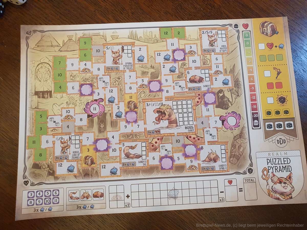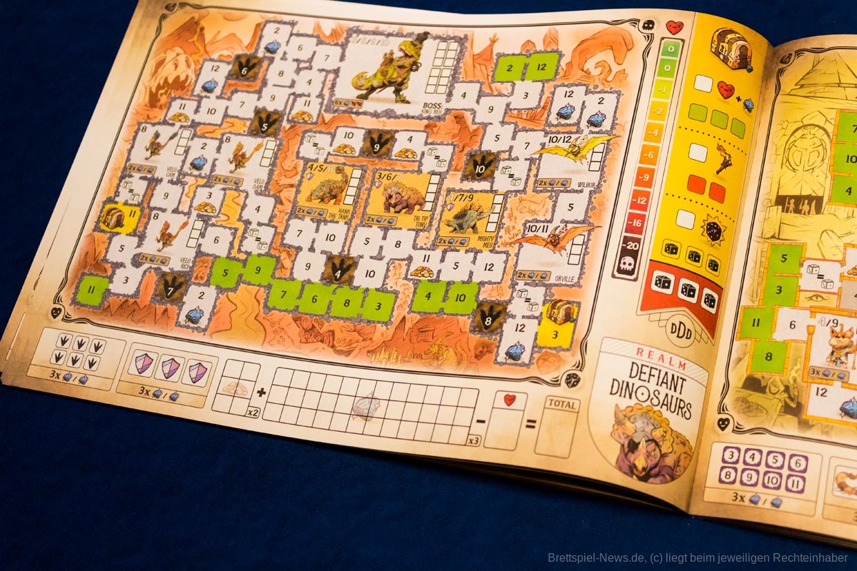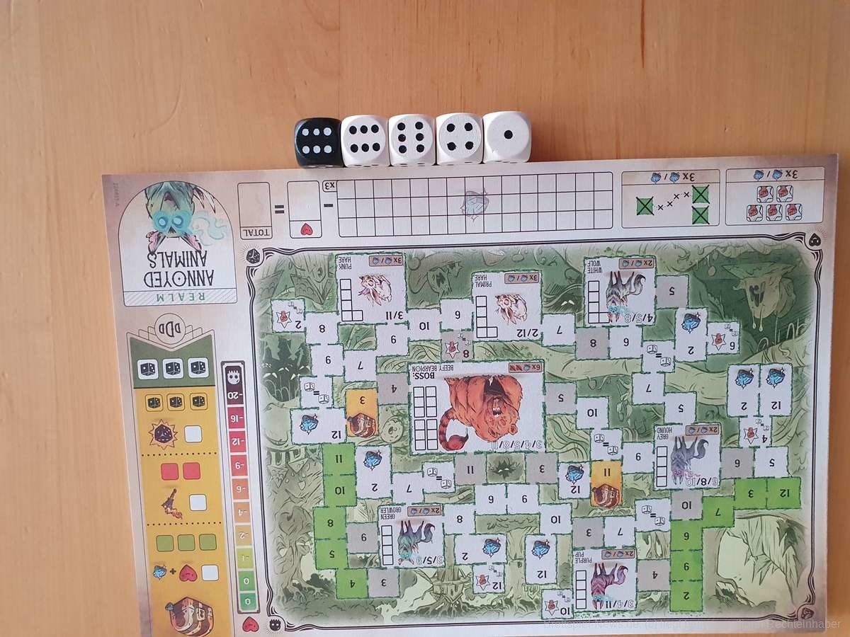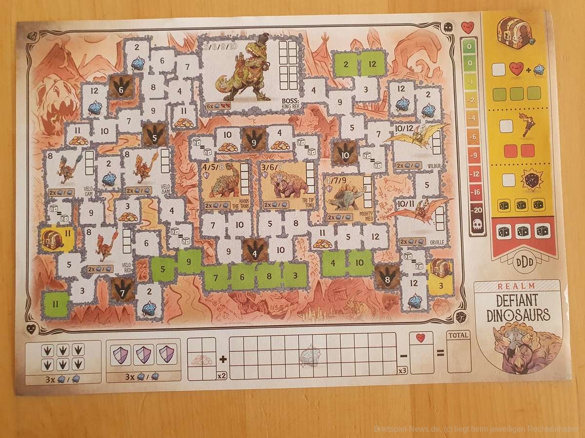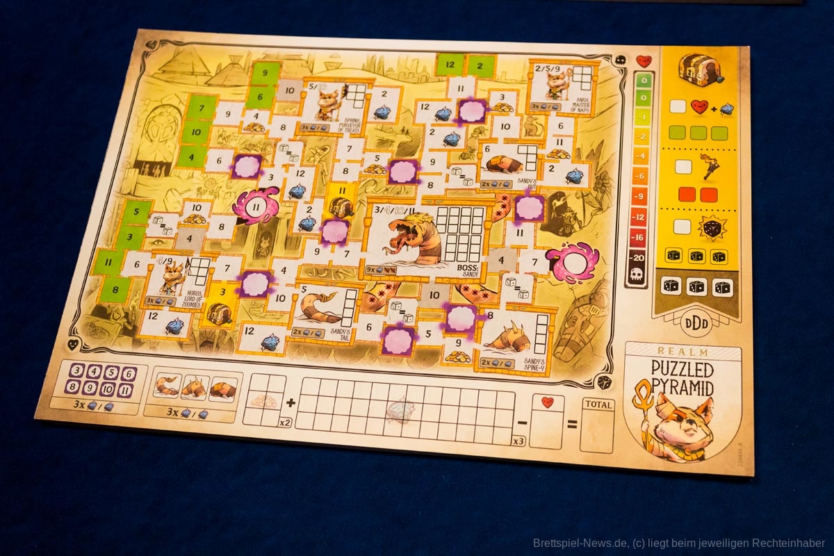 Der Name des Spiels ist meiner Meinung nach etwas unglücklich gewählt, da er nicht eingängig ist. Zwar setzt sich die Alliteration in den Namen der vier Spielblätter fort, aber ein eingängigerer Name für das Spiel hätte ihm gut gestanden, z.B. „Dice Dungeons“.
