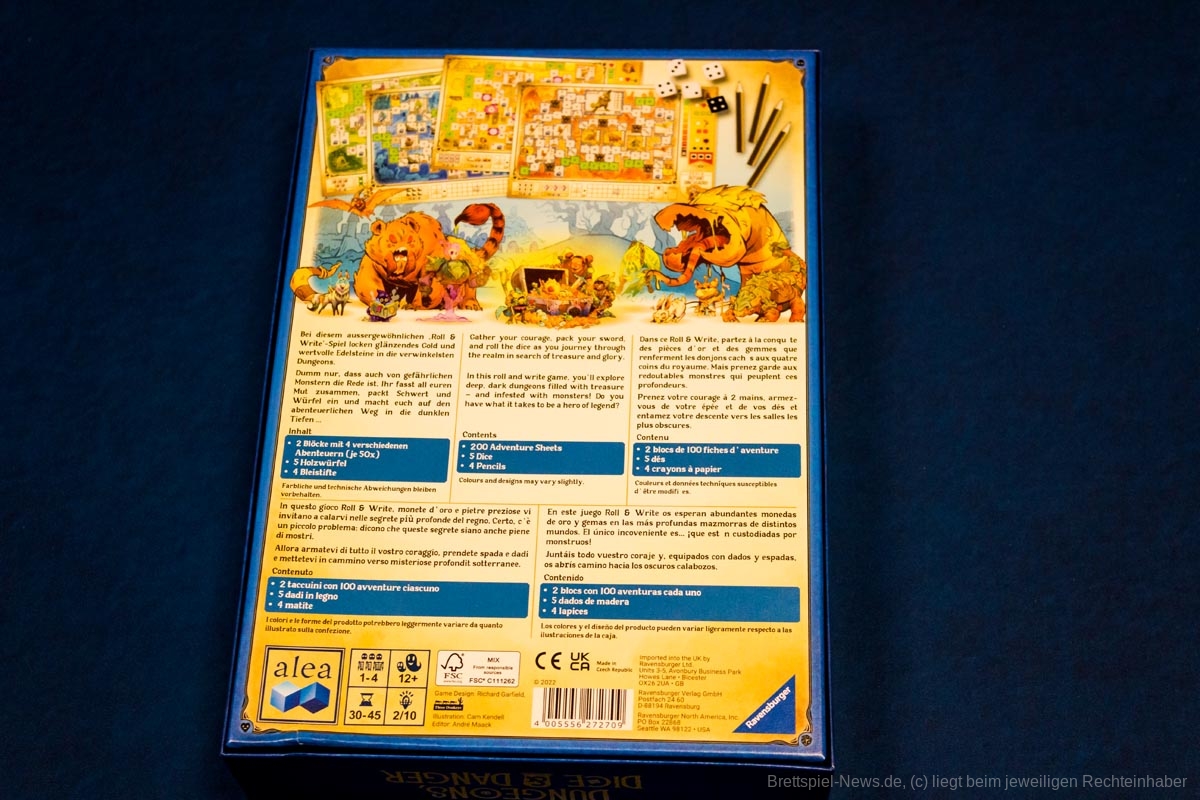 „Dungeons, Dice & Danger“ ist ein kurzweiliges Roll & Write - Familienspiel mit kniffligen, aber gut erlernbaren Regeln. Die einzelnen Feinheiten, insbesondere bei den Sonderregeln der einzelnen Blätter, müssen während des Spiels immer wieder einmal nachgesehen werden. Dennoch ist ein Einstieg in das Spiel sehr gut möglich und selbsterklärend. Die Grafiken auf den Blättern sind ebenfalls selbsterklärend und orientieren sich an gängigen Schemata (z.B. Lebensleiste), so dass sie ohne weitere Erklärung verstanden werden.