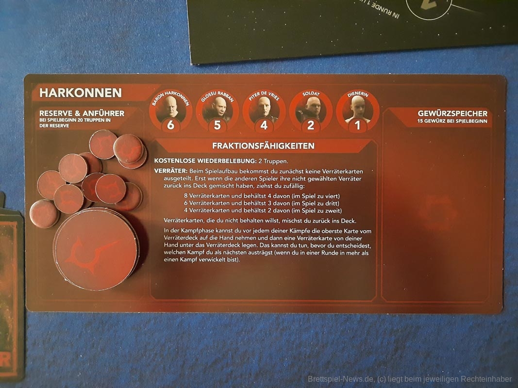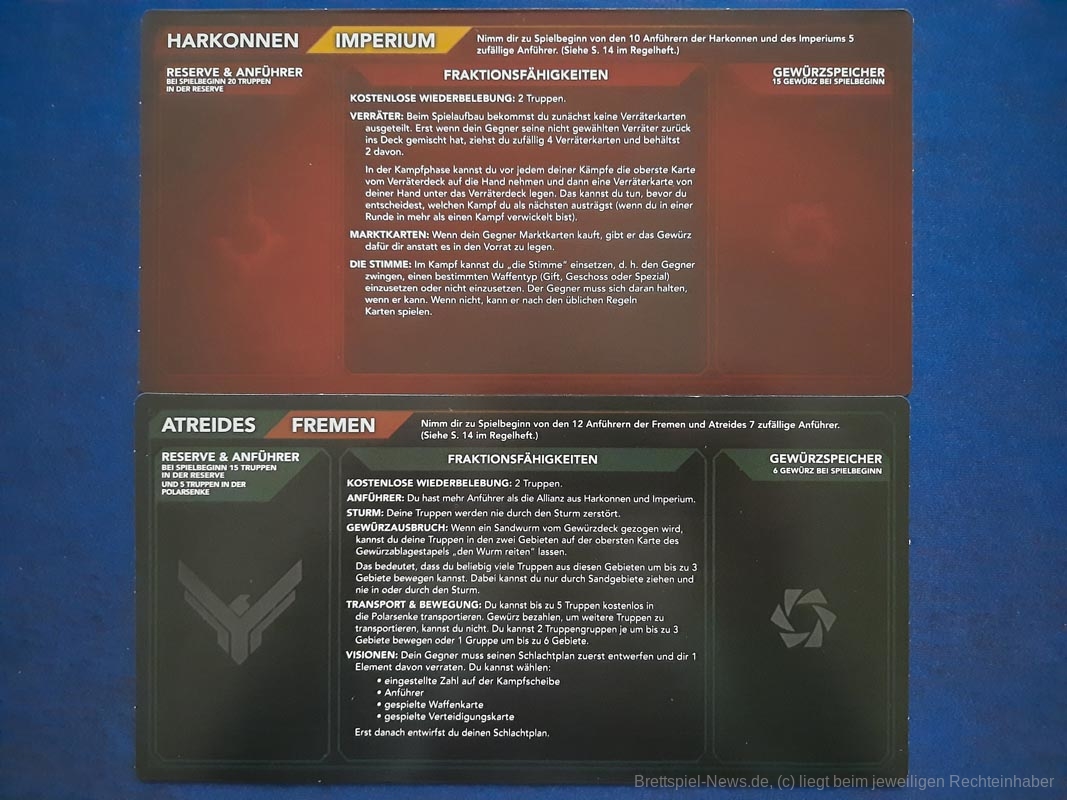Bis hierhin klingt dies gut, strategisch und nach Spannung, leider sieht die Realität meist anders aus. Wenn die passenden Kampfkarten fehlen oder der Gegner ständig die Spezialkarten zieht, können die Kämpfe schnell sehr einseitig aussehen. Zudem bedeuten verlorenen Kämpfe verlorene Truppen und unter Umständen verlorene Anführer. Der Gegner erleidet zwar ebenfalls Verluste, kann diese dank der Gewürze jedoch wiederbeleben, mehr Truppen einsetzen oder Marktkarten kaufen. Dadurch hat diese Person nicht nur eine bessere Position auf dem Spielplan für die nächste Runde, sondern dazu noch mehr Ressourcen. So bedeuten ein bis zwei verlorene Kämpfe zu Beginn schnell einen meist nicht aufholbaren Rückstand. Insbesondere mit den Harkonnen oder Atreides ist dies problematisch, da diese weder kostenlos Truppen einsetzen können (Fremen) noch Gewürze von den Gegnern bekommen, wenn diese Marktkarten kaufen (Imperium).