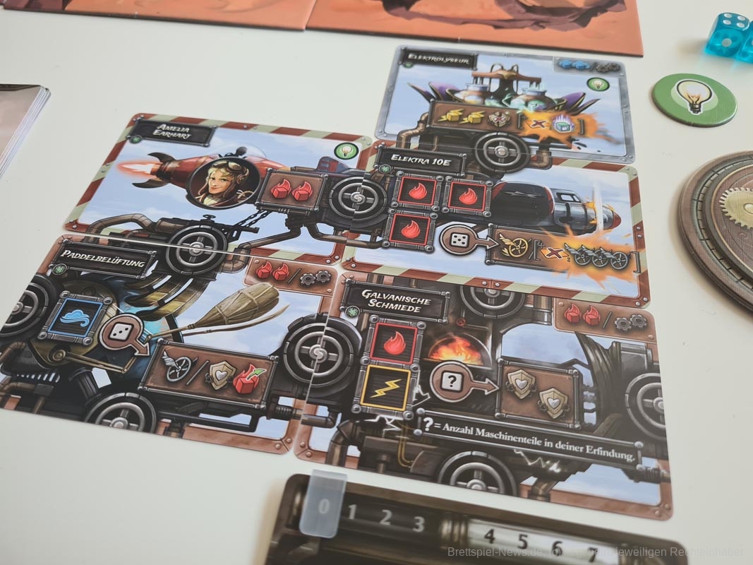 Natürlich kann das lustig sein, aber es geht zum Schluss immer noch darum ein Rennen zu gewinnen und die anderen abzuhängen. Und dafür bietet „Steampunk Rally Fusion“ eine extreme Spieltiefe an. So kann es unterschiedliche Spielstile und -strategien geben, die einen zum Ziel bringen können. Schnell wird einem klar, dass manche Maschinenteile nur dafür gut sind, sie direkt wieder explodieren zu lassen, um mit dem Schwung der Explosion weiterzukommen. In kaum einem Spiel habe ich es erlebt, dass eine Maschine so aufeinander aufbaut und im wahrsten Sinne des Wortes zu einer „gut geölten Maschine“ wird, in der alle Zahnräder ineinandergreifen.