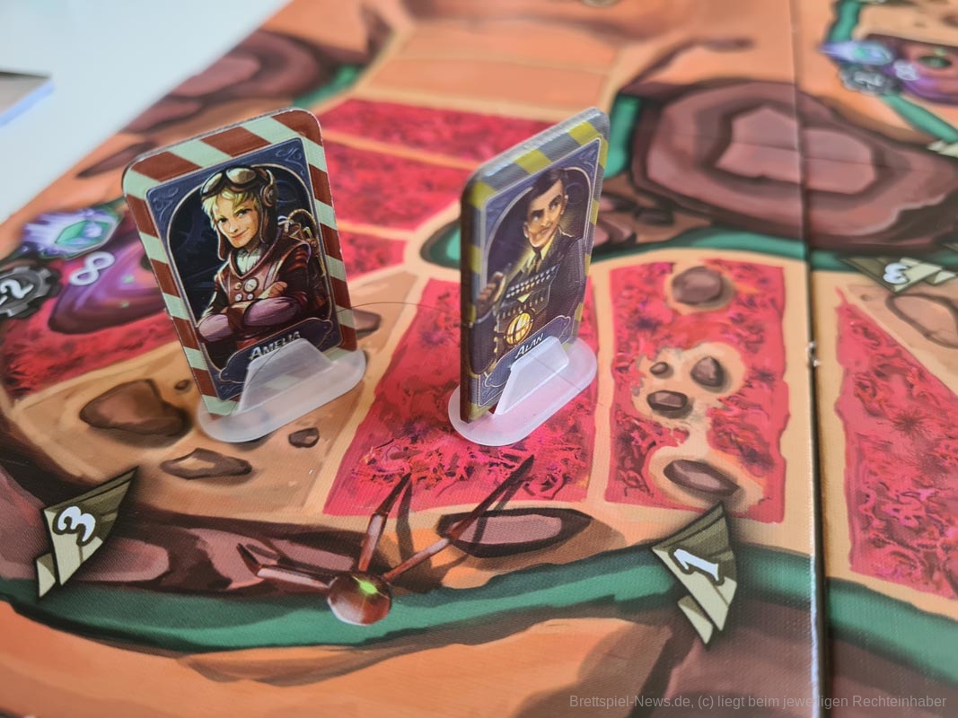 Im Vergleich zum ersten „Steampunk Rally“ bietet „Steampunk Rally Fusion“ zudem noch mehr Spieltiefe. Durch die geheimen Spielziele kommen noch mehr Entscheidungen ins Spiel, da es unter ihnen sogar Waffen gibt und eine Art „Take That-Mechanik“ eingebaut wird. So können Gegenspielende damit einmalig abgeschossen werden, um sie vielleicht sogar zur Explosion zu bringen und sie damit wieder hinter die letztplatzierte Person zu katapultieren. Natürlich gibt es viele Möglichkeiten sich vor so etwas zu schützen, aber wer zu unachtsam ist oder zu wenig Optionen geplant hat, kann durch sein risikoreiches Verhalten schnell den kürzeren Ziehen. Eine weitere Neuerung sind die Ereigniskarten, die die Draftrichtung verändern können und spezielle Effekte für besondere Felder auf dem Spielfeld auslösen. Gefahren lauern damit hinter jedem Stein und sollten immer im Auge behalten werden. Die neuen Fusionswürfel sind eine nette Neuerung, kommen im Spielverlauf aber eigentlich kaum vor.