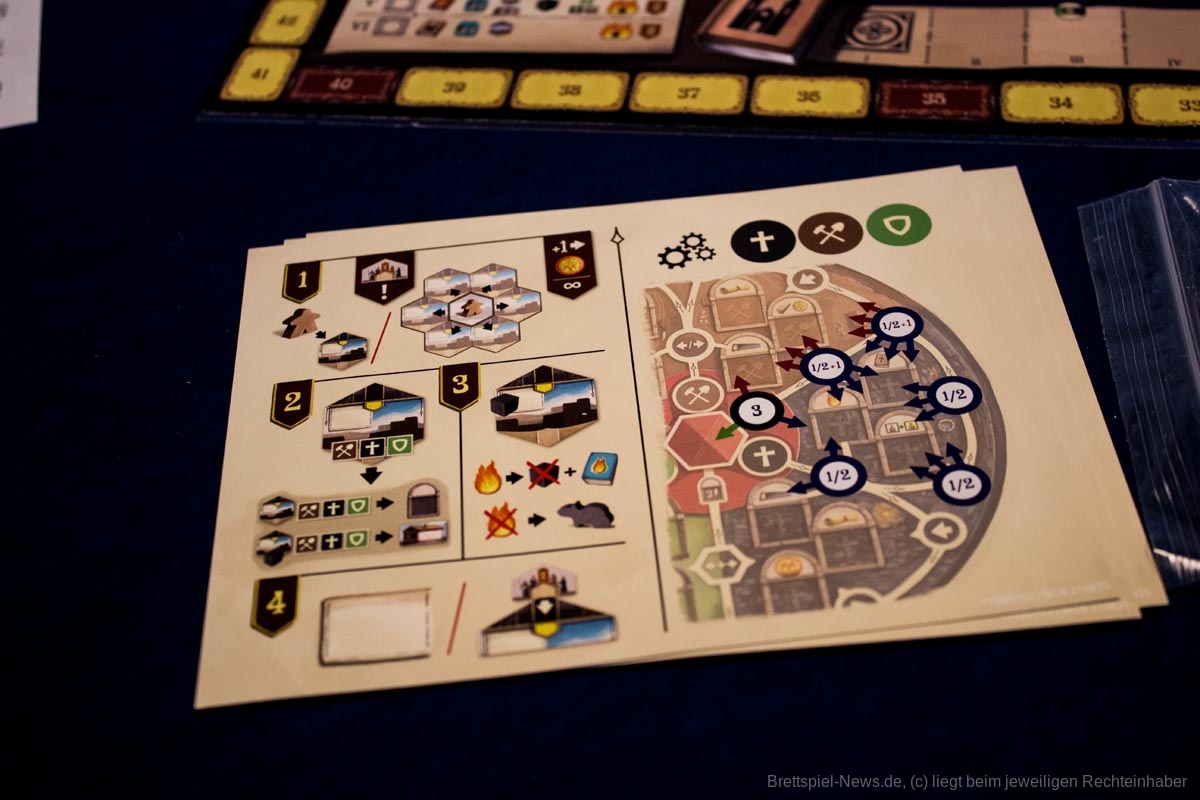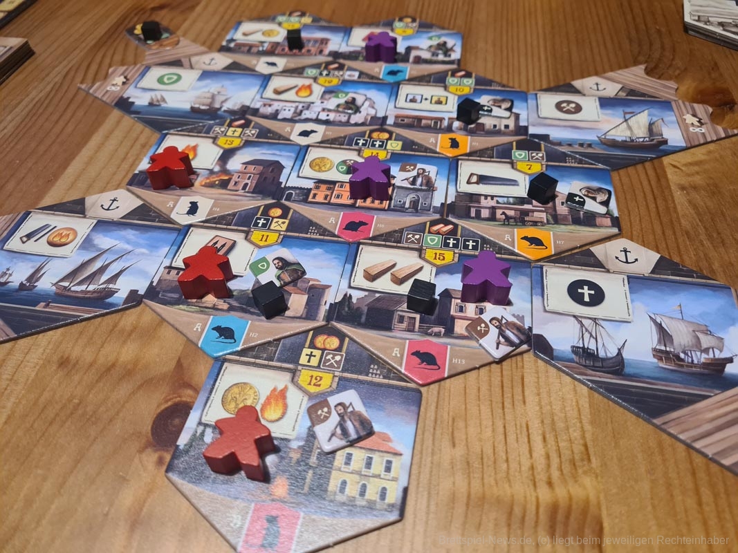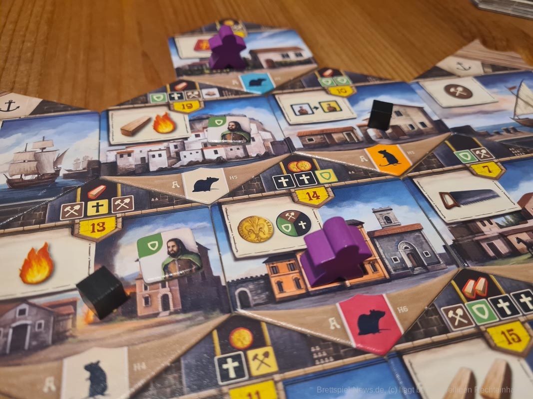 Die Pest an sich ist im Thema nur eine „nervige Nebensache“. Durch die Pestmarker sterben nur Bewohnerplättchen, die in einer Runde nicht gerettet wurden, während ein Pestwürfel auf ihrem Feld lag. Alle anderen gehen ein wenig in Quarantäne, in der sie im Bestfall ja schon ein wenig arbeiten, um danach in die Werkstätten oder auf die Felder geschickt zu werden. Entscheidet sich eine Person einmal, nicht gegen die Pest zu kämpfen, obwohl ein eigener Meeple auf einem solchen Feld steht, stirbt dieser Meeple nicht einmal. Diese Person erhält nur einen „Ratten-Token“ der zum Ende des Spiels einfach Minuspunkte einbringt. Besonders durch mein persönliches Interesse am Thema war ich hier doch etwas enttäuscht, dass es im Grunde doch austauschbar gewesen wäre, bzw. andere Thematiken das Spiel vielleicht noch in viel besserem Licht hätten erstrahlen lassen.