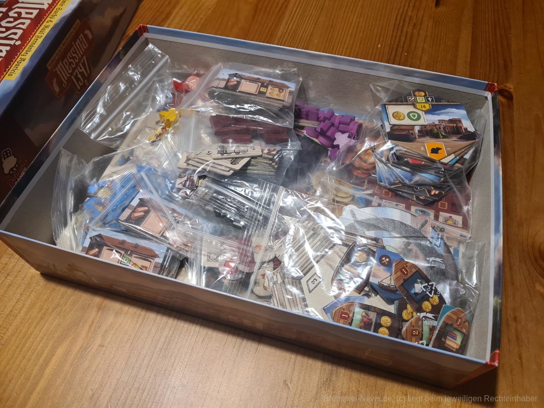 Während die Regeln einem leichten Einstieg einen großen Dienst erweisen, tut es das Spielmaterial und die Spielschachtel aber wieder nicht. „Messina 1347“ besitzt sehr viel unterschiedliches Spielmaterial, das auf- und wieder abgebaut werden will. Da die Spielschachtel über kein Sortiersystem verfügt, können alle Token nur in kleinen Plastiktüten aufbewahrt werden, wovon zu wenig mitgeliefert werden, um das Spielmaterial sinnvoll zu sortieren. Auch hier mag das zwar ein Punkt sein, der mir persönlich sehr aufstößt, während andere grade ein großes Fragezeichen über dem Kopf haben, dennoch empfehle ich hier aber ein separates Sortiersystem zu schaffen oder sich die fehlenden Einlagen anderweitig zu ersetzen. So kann der Auf- und Abbau massiv verkürzt und angenehmer gemacht werden.