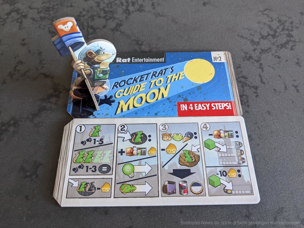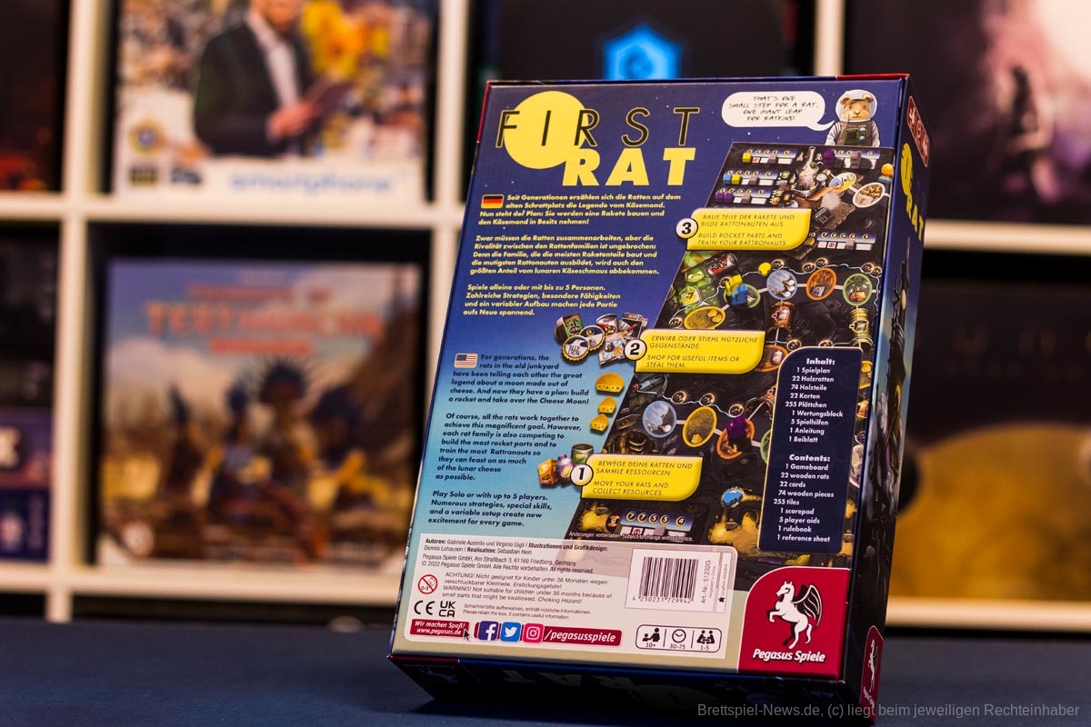 In „First Rat” versuchen wir gemeinsam eine Rakete zu bauen, um den Käsemond zu erreichen. Auf dem Weg dahin, wollen die Familien, jede für sich, die meisten Siegpunkte sammeln. Das Spiel wirkt zunächst wie ein klassisches Leiterspiel, kommt dabei jedoch völlig ohne Würfel aus. Im eigenen Zug haben wir die Wahl uns mit einer Ratte bis zu fünf Schritte zu bewegen und die entsprechende Belohnung des Feldes aufzunehmen. Die Besonderheit des Spiels liegt in der zweiten Bewegungsoption. Bei dieser dürfen wir so viele Ratten wie wir wollen - ein bis drei Felder weit -bewegen. Dies funktioniert allerdings nur dann, wenn alle Ratten auch auf einem gleichfarbigen Feld enden. Im Spiel gilt es nun seine Ratten so geschickt zu platzieren, dass möglichst viele Ratten auf einmal bewegt werden können, um die meisten Belohnungen zu verdienen.