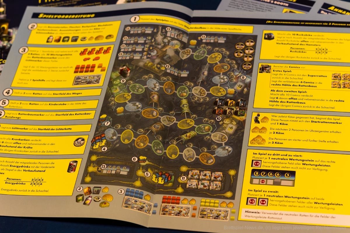 Wo die Sonne hell auf unseren Schrottplatz scheint, gibt es aber auch Schatten. Die Fähigkeiten der Superratten fühlten sich für uns sehr unausgeglichen an, insbesondere Arnold Rattenegger fühlte sich zu übermächtig an, da er unverhältnismäßig viele Ressourcen sammeln kann, sodass wir ihn aus den folgenden Partien verbannt haben. Außerdem konnte uns der „Stehlen“-Mechanismus leider gar nicht überzeugen und hat für uns eher das Spielgefühl getrübt. So wurde meist so schnell wie möglich zum ersten Händler durchgerannt, um dort einen Rucksack zu stehlen. Dann wieder zurück an den Anfang um dann erst mit dem Ressourcensammeln zu beginnen. Außerdem hatten wir schnell das Gefühl das Spiel „geknackt“ zu haben, sodass der Wiederspielreiz für uns recht schnell zum Erliegen kam. Auch der modulare Spielplan kann das Spiel von Runde zu Runde nicht so stark verändern, dass hier ein besonderer Wiederspielreiz entstehen würde.