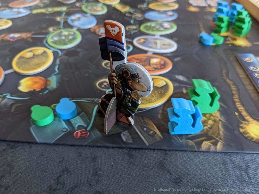 Mit Hilfe der letzten Aktion im Spiel können wir durch das Ausgeben der gesammelten Materialien Raketenteile bauen und somit Siegpunkte generieren. Neben den oben genannten Aktionen gibt es noch zwei Leisten, die dabei helfen das Spiel zu gewinnen. Mit Hilfe der Lichterleiste können wir mehr Ressourcen bekommen, sollte das Licht auf einem Feld vor oder neben unserer Ratte liegen. In unserem Bau am unteren Ende des Spielfelds ermöglicht unsere kleine Ratte neue Ratten aus dem Bau zu rekrutieren, spezielle Fähigkeiten zu erhalten oder Siegpunkte auf einer speziellen Leiste zu generieren.