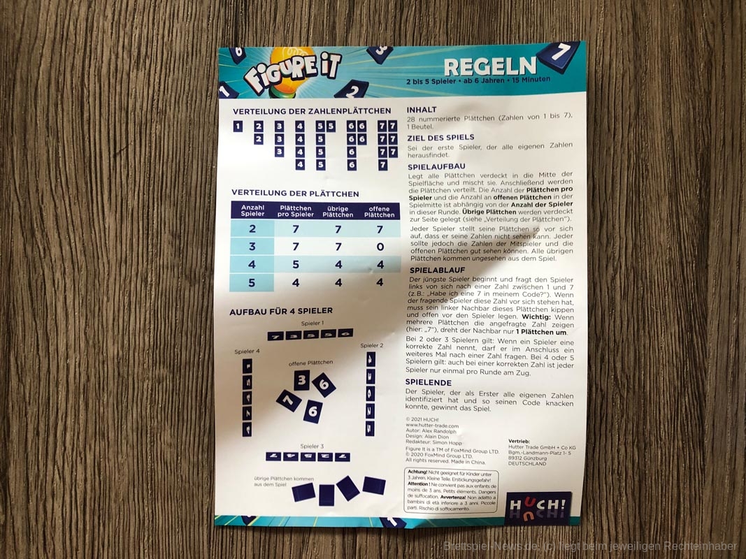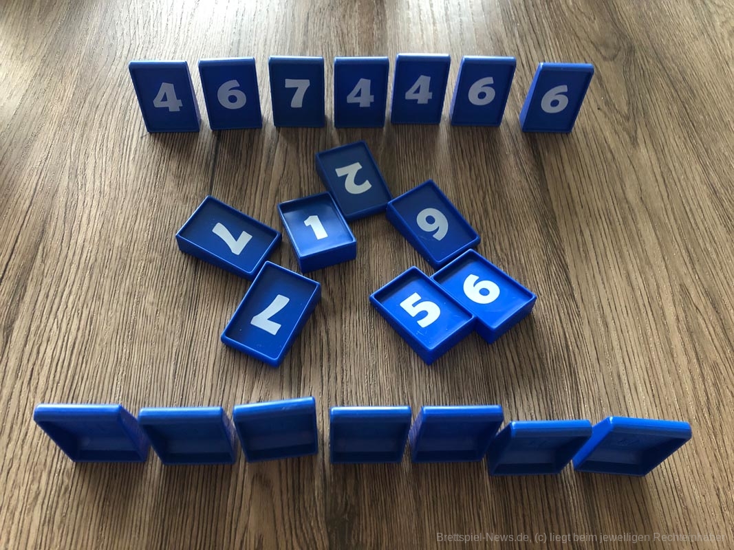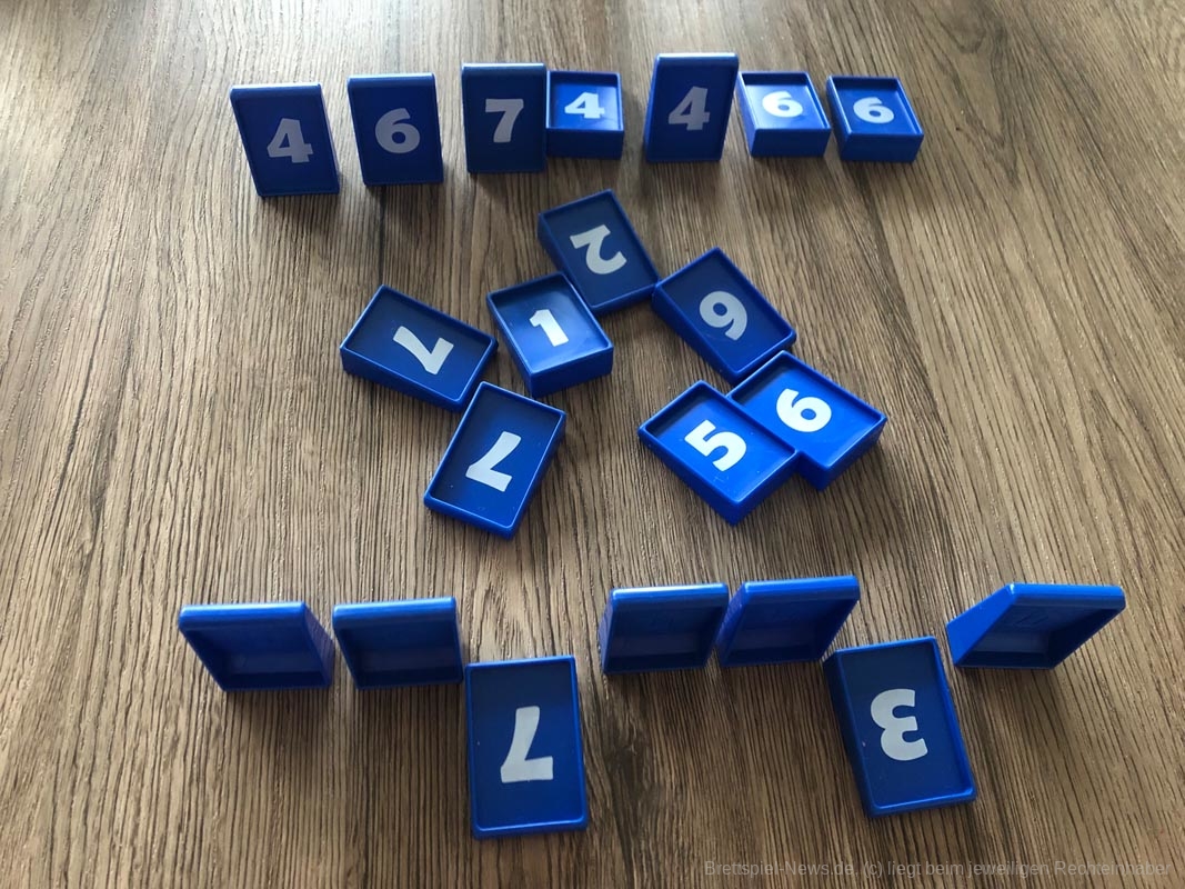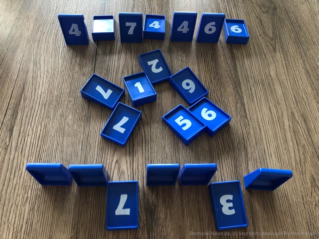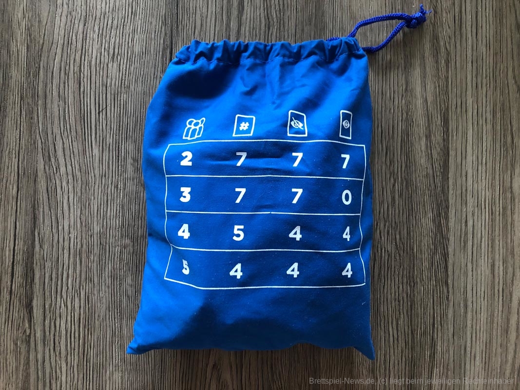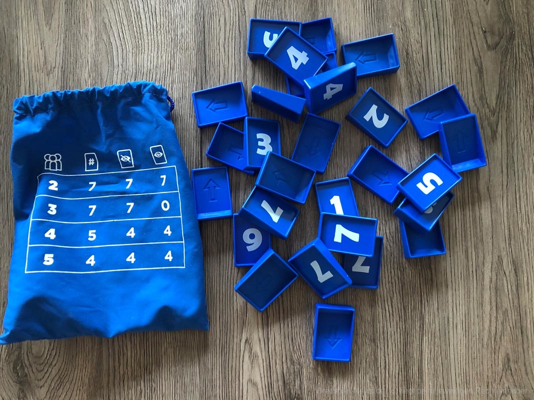 Bezüglich des Spielmaterials war ich zunächst etwas enttäuscht, da der Karton nicht wirklich stabil wirkt und die Anleitung auch nur eine Seite aus sehr dünnen Papier darstellt. Doch ich sollte eines Besseren belehrt werden: Die Nummernplättchen werden in einem Stoffbeutel ausgeliefert, auf dem je nach Anzahl der Personen aufgedruckt ist, wer wie viele Plättchen bekommt, wie viele Plättchen aus dem Spiel genommen werden und wie viele Plättchen offen in die Mitte gelegt werden. Weitere Regeln werden nicht benötigt. Somit ist es nicht schlimm, wenn Karton oder Anleitung kaputt gehen.