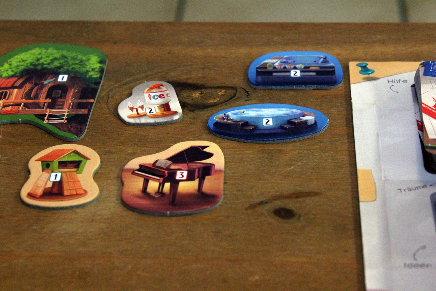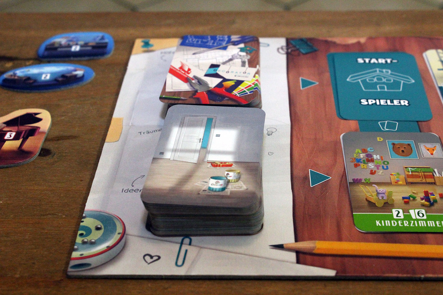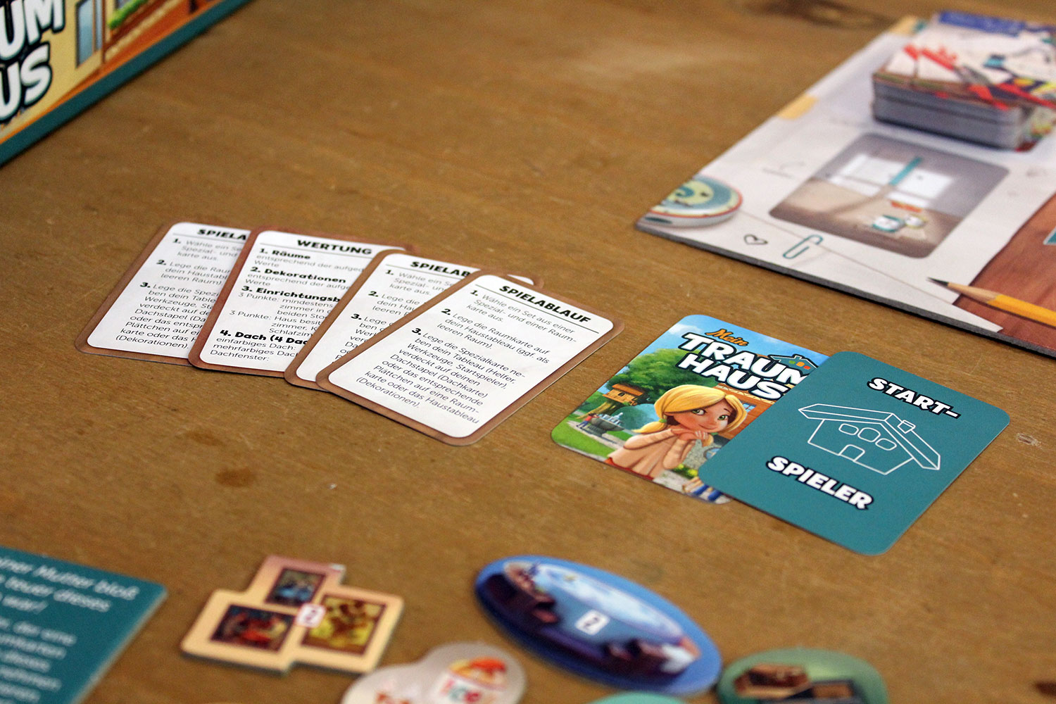 Mit Spezialkarten können Räume aufgewertet werden und bringen dann zusätzliche Punkte. Zudem müssen Dachkarten gesammelt werden. Am Spielende können darüber zusätzliche Punkte gesammelt werden. Als letztes verbergen sich in den Spezialkarten noch “Werkzeuge”, die unter anderem das Tauschen von Karten ermöglichen.