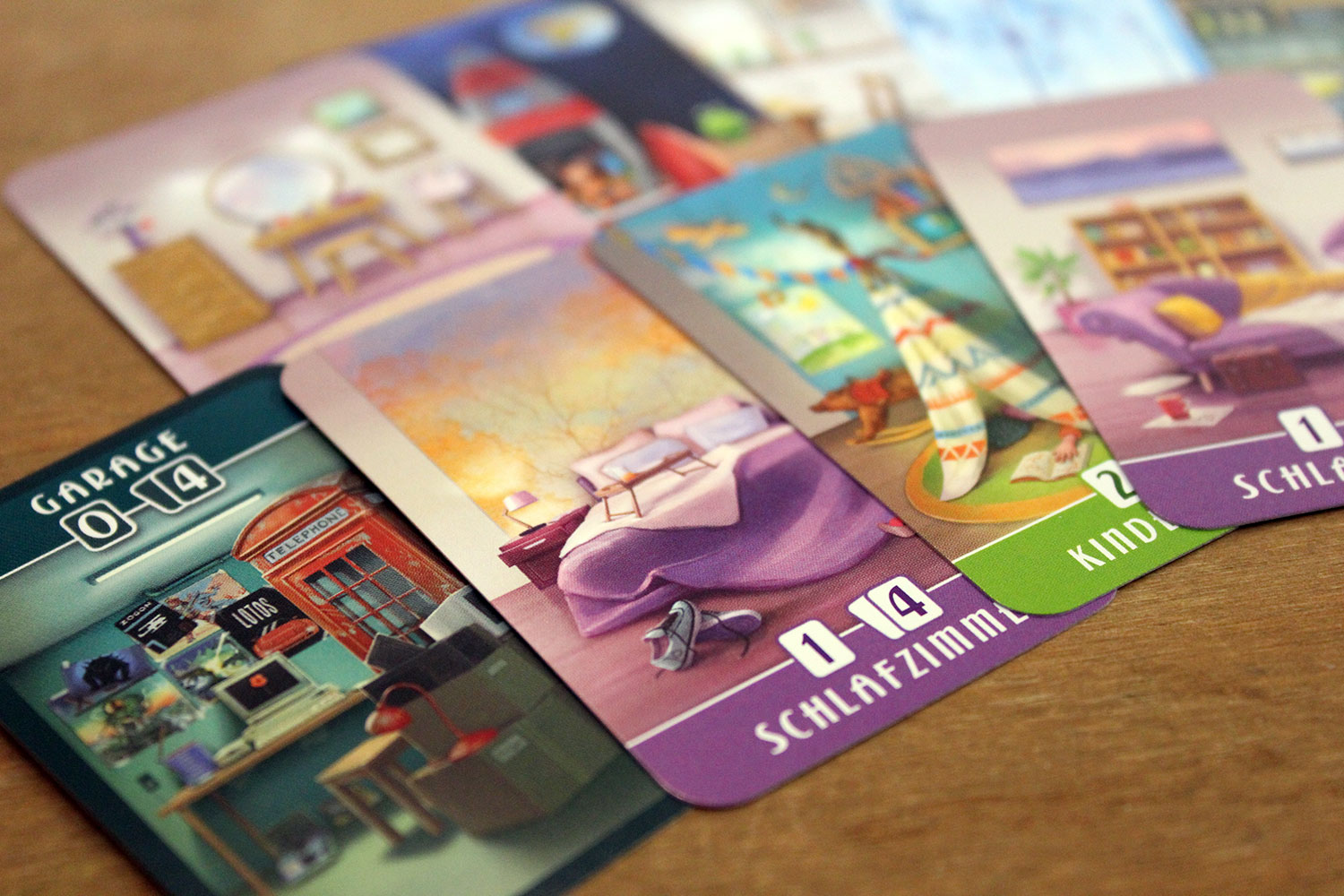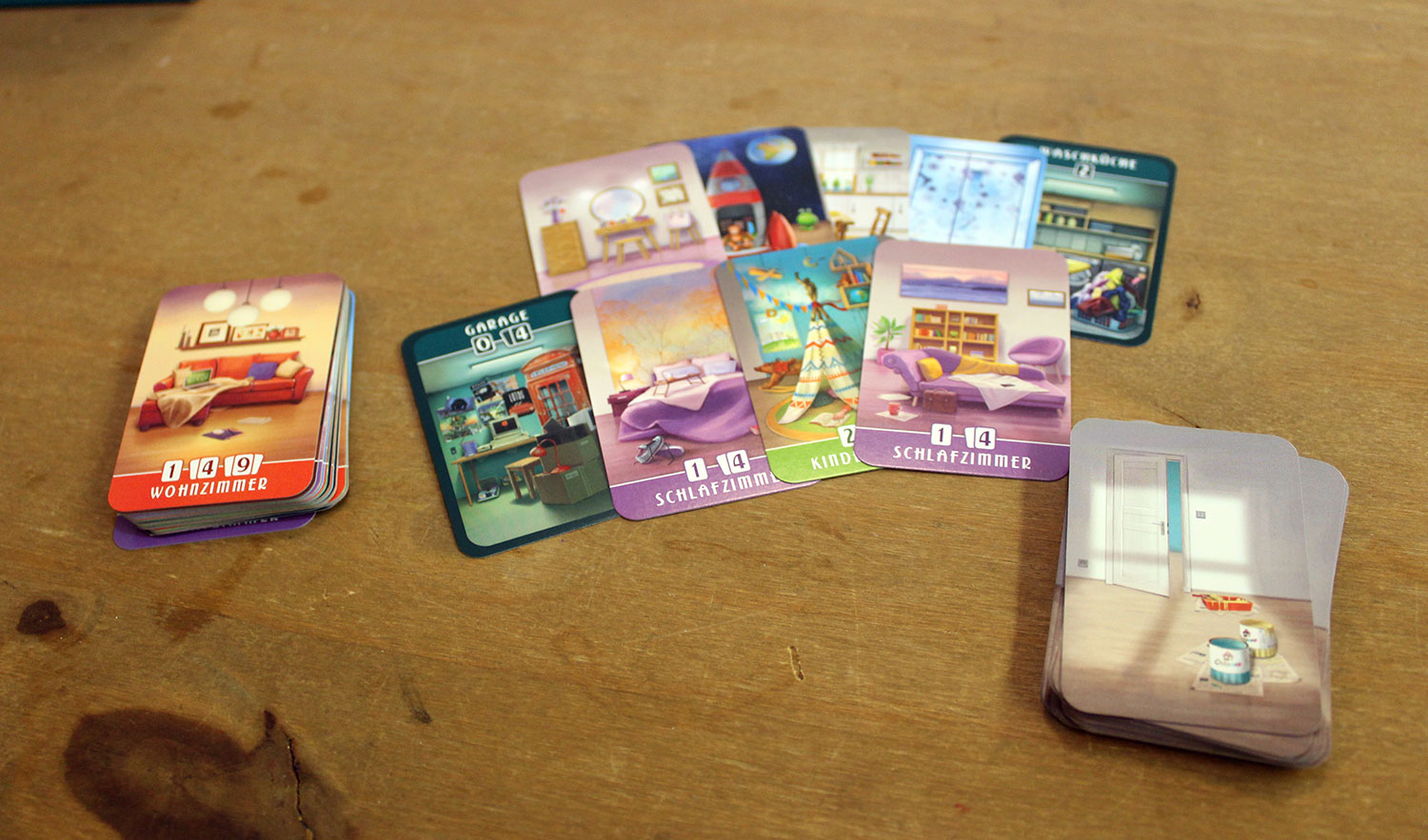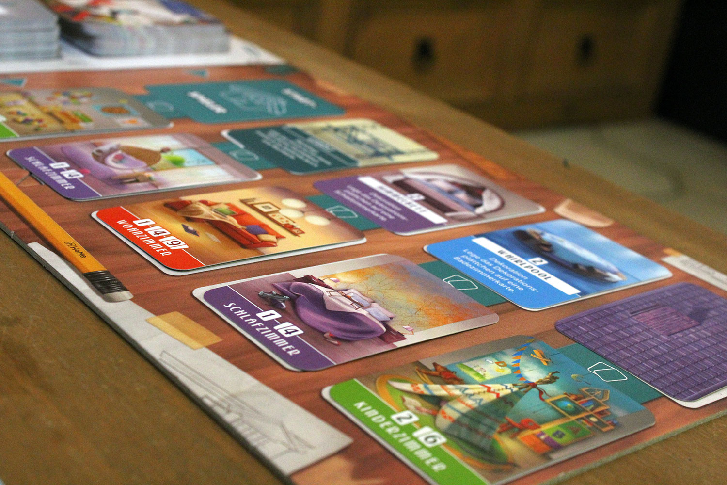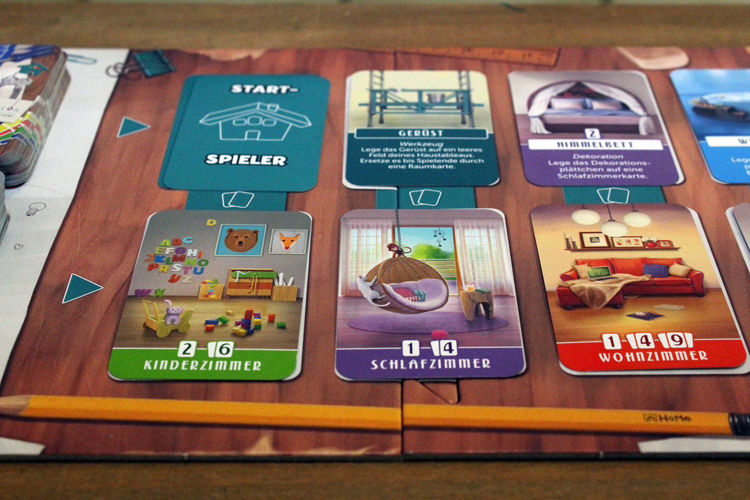 Ein Wohnzimmer ist zum Beispiel groß. Eine Karte davon bringt lediglich ein Punkt. Drei Karten davon bringen hingegen neun Punkte, was dann auch dem maximalen Ausbau entspricht. Das Badezimmer benötigt jedoch nur einen Kartenplatz auf dem Tableau.