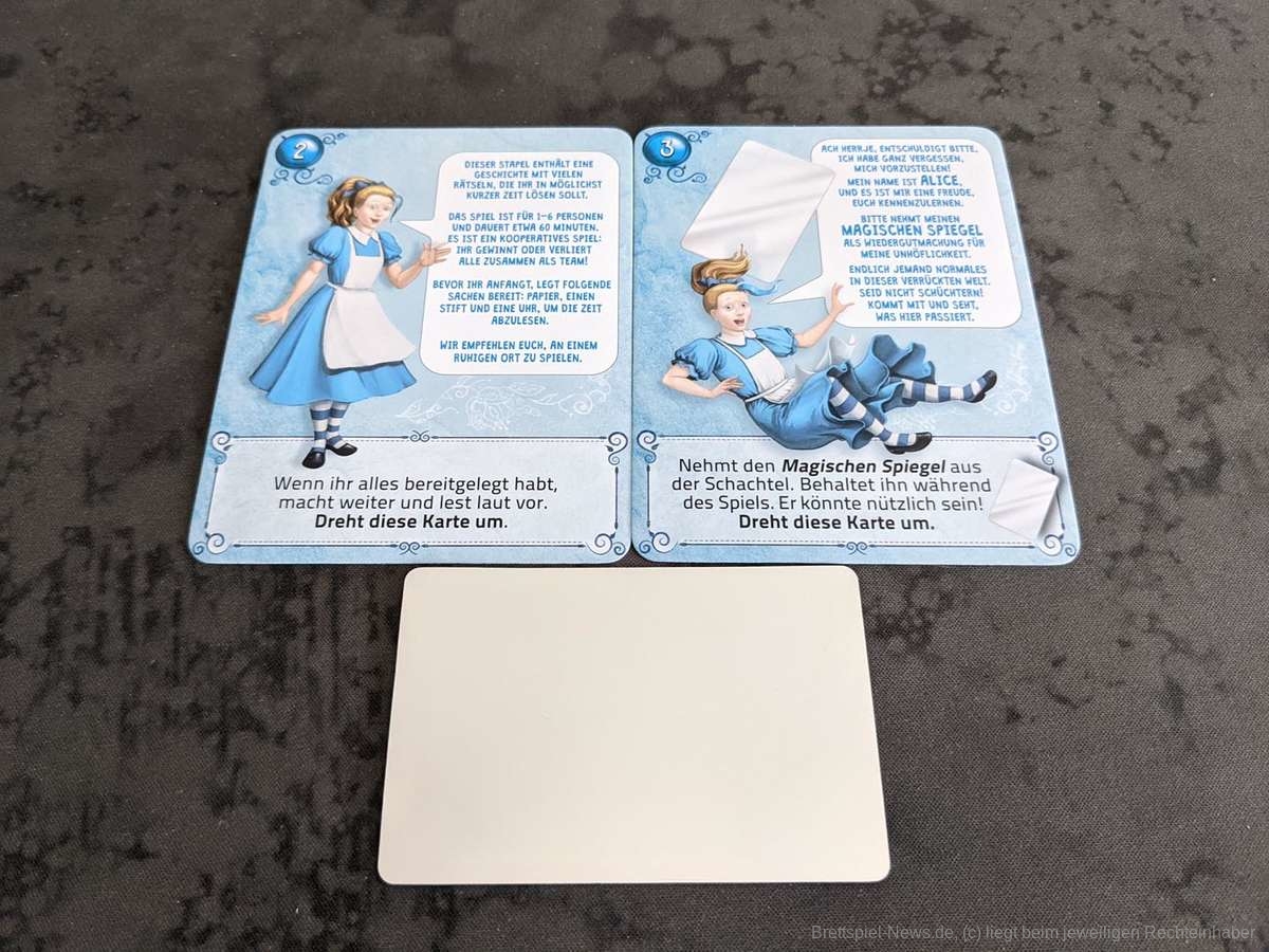 Die Illustrationen von Alberto Bontempi sind für uns ein Highlight dieses Spiels, da sie die Welt des Wunderlandes sehr schön einfangen. Die Grundgeschichte von „Deckscape: Im Wunderland“ ist ganz nett, jedoch eher nur eine etwas veränderte Variante der Ursprungsgesichte rund um Alice. Hier hätten wir uns etwas mehr Kreativität gewünscht. Apropos Kreativität: Die Rätselvarianz hat uns positiv überrascht, da für die Gestaltung der Rätsel nur Karten zur Verfügung stehen. So müssen wir mal die Karten in bestimmter Reihenfolge anordnen, Hinweise auf Karten finden oder mit dem beigelegten Spiegel interagieren, um die Rätsel lösen zu können. Besonders gut gefällt uns, dass hierbei kein Spielmaterial zerstört wird und man das Spiel somit an andere Exit-Games-Fans weitergeben kann.