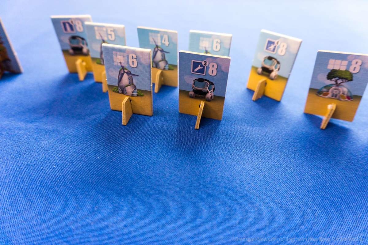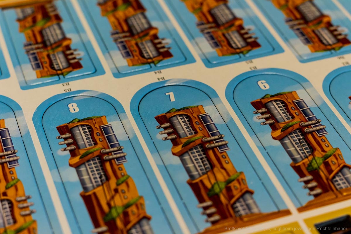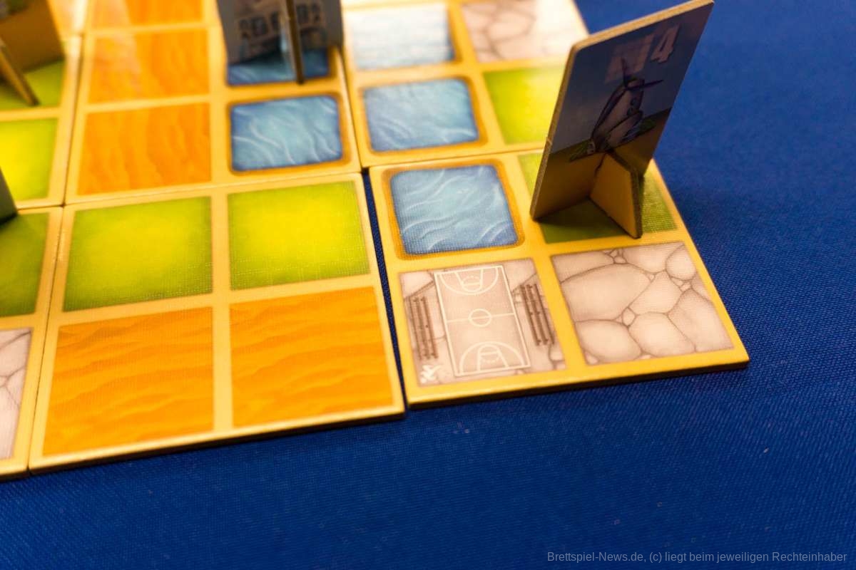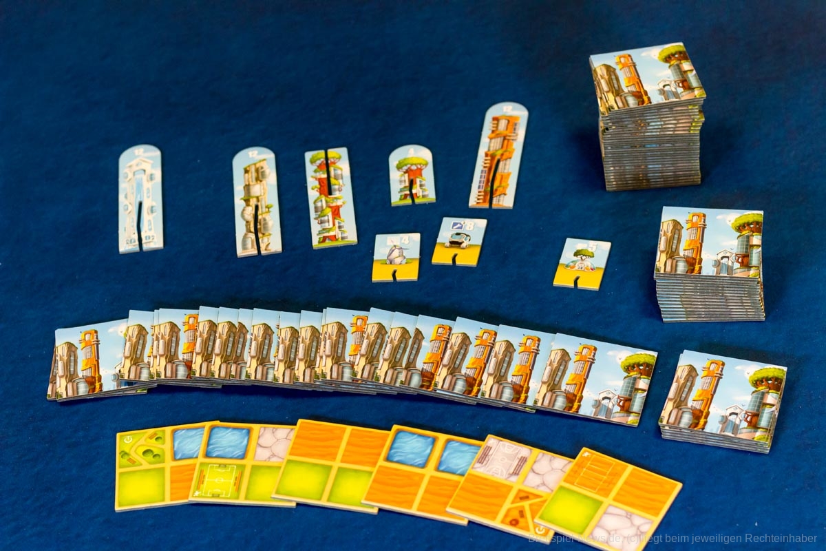 Oh man... Kommen wir gleich zum großen negativen Punkt. Ich mag keine Spiele, in denen jeder für sich werkelt und man kaum auf das Spielverhalten der anderen Einfluss nehmen kann. Die Spielerinteraktion in Neoville geht leider gegen Null. Aber dies ist schon viel zu weit vorgegriffen. Neoville ist ein einfaches Legespiel, indem ich eine Karte in meinen Bereich lege und eine 4x4 große Fläche zusammenpuzzle. Die Wolkenkratzer und Bioprojekte sind dabei der entscheidende kleine Kniff im Spiel. Letztendlich ist nämlich ausschlaggebend, wann ich mir die großen Punkte bringenden Wolkenkratzer schnappe. Wartet man zu lang, so können die punkteträchtigen Gebäude schon weg sein. Hier spielt Timing eine wichtige Rolle. Schnappt man sich ein Gebäude zu früh, so läuft man Gefahr, die erforderliche Gebietsgröße nicht mehr errichten zu können. Zum Glück wurde dem Zufallsprinzip mit den vier offen ausliegenden Stadtkarten entgegengewirkt. Sollte einem die Auslage zum Nachziehen nicht gefallen, so kann weiterhin eine verdeckte Karte vom Nachziehstapel gezogen werden. Dies ist auch wichtig, da eine gründliche Planung von Vorteil ist.