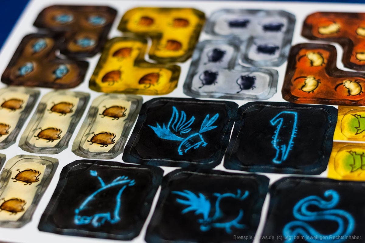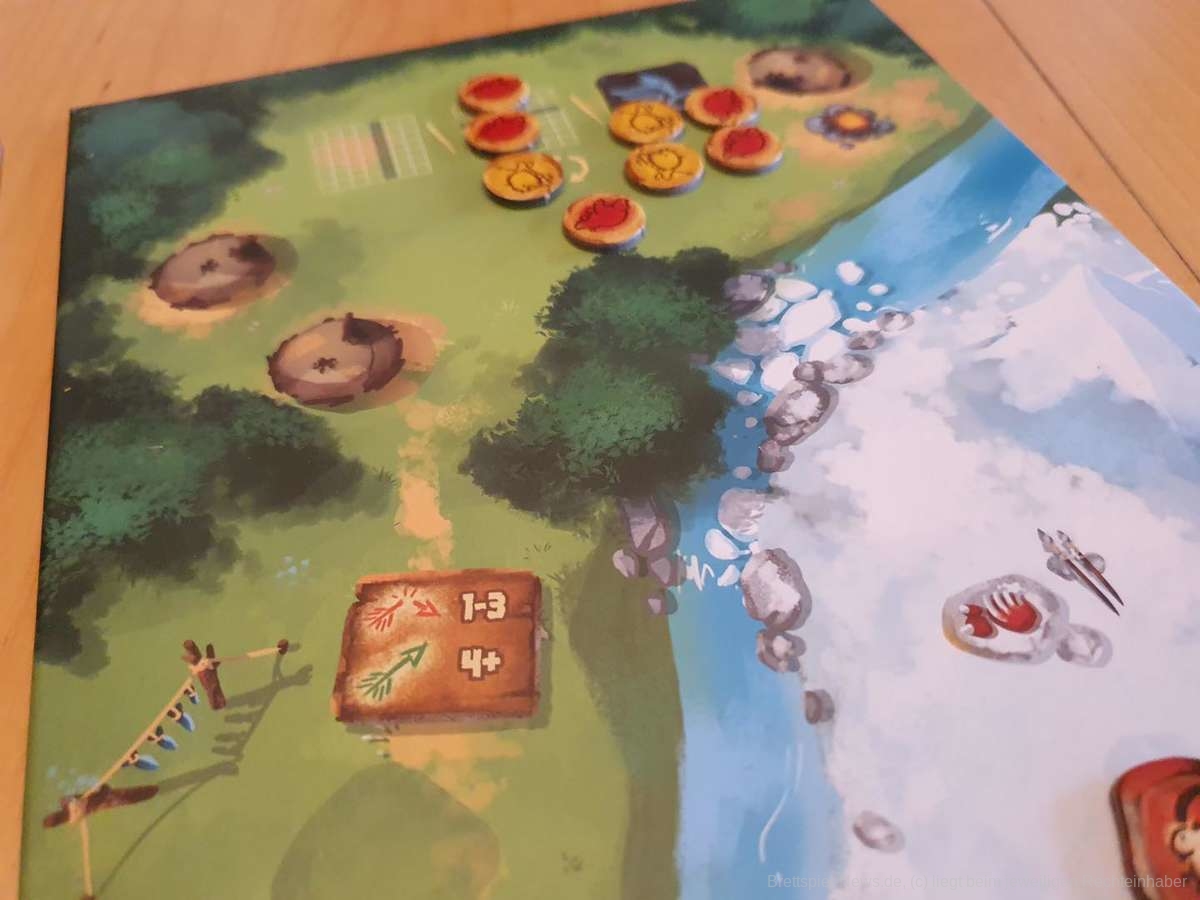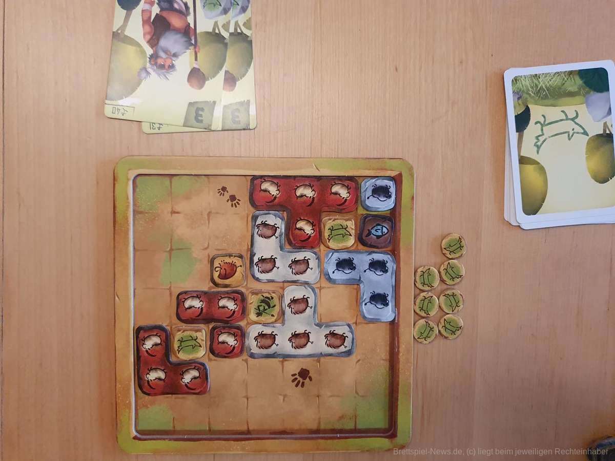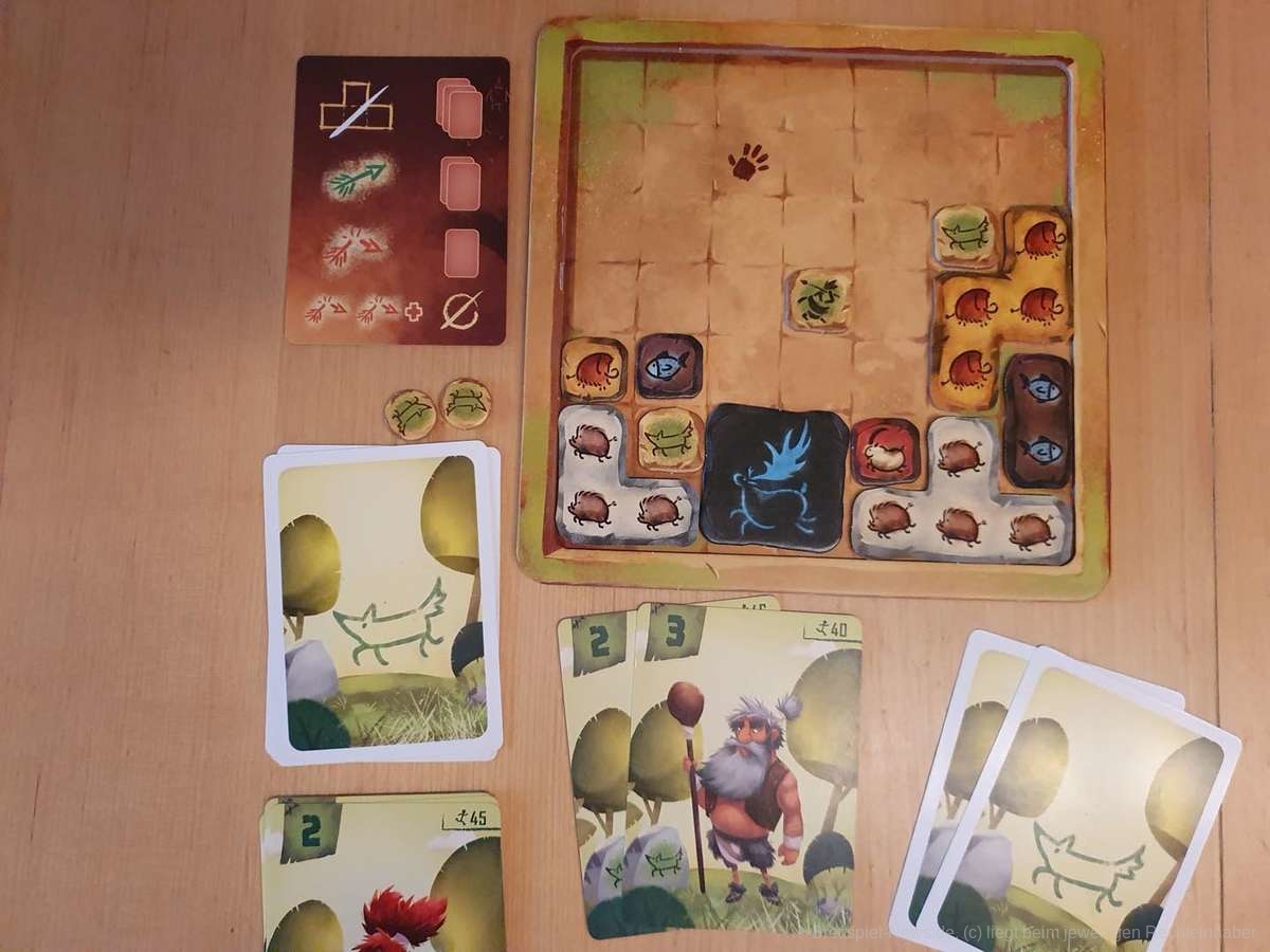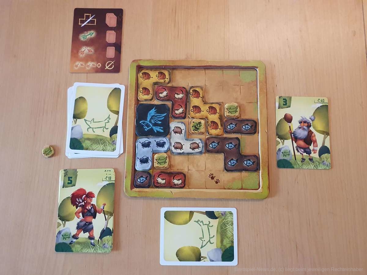 So füllen nun alle Personen nach und nach ihre Höhlen und versuchen dabei, die Platzierung der Tierplättchen an den ausliegenden Zielen zu orientieren.
