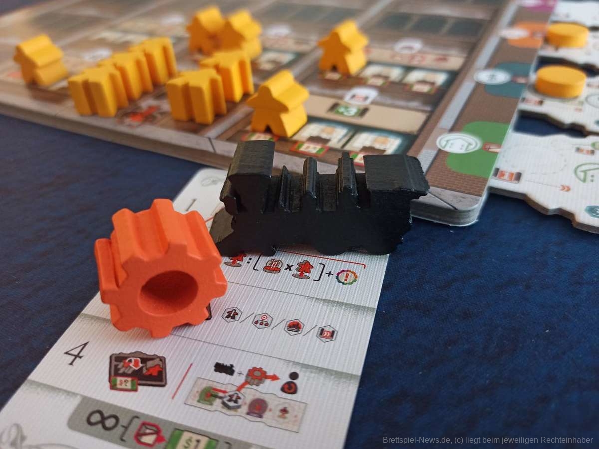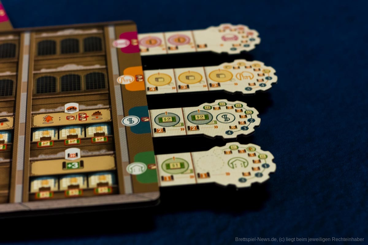 Anders als bei vielen anderen Spielen wurde bei „Carnegie“ so gut wie keine Luft verpackt. Die längliche Box ist bis oben gut gefüllt und nimmt somit im Spielregal ein Minimum an Platz weg. Beim Spielmaterial wurde nicht gespart. Triple Layer Boards, in die die Projektstreifen geschoben werden können, dicke Holz-Aktionssteine und Holzmeeple in hübschen, kontrastreichen Farben lassen das Herz höherschlagen.