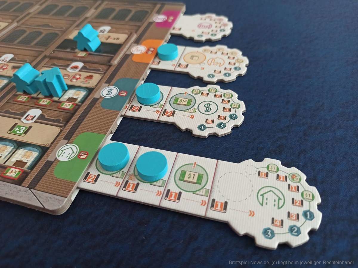 Das Spiel an sich ist sprachneutral und nach etwas Eingewöhnung sitzt auch die Ikonographie ziemlich gut. Anfangs ist die allerdings vor allem bei den vielen Abteilungen etwas abschreckend. Hier hilft die Anleitung zwar souverän, dennoch muss anfangs häufig die Funktion der verschiedenen zum Kauf verfügbaren Abteilungen nachgeschaut werden. Dies ist aber auch schon unser größter Kritikpunkt.