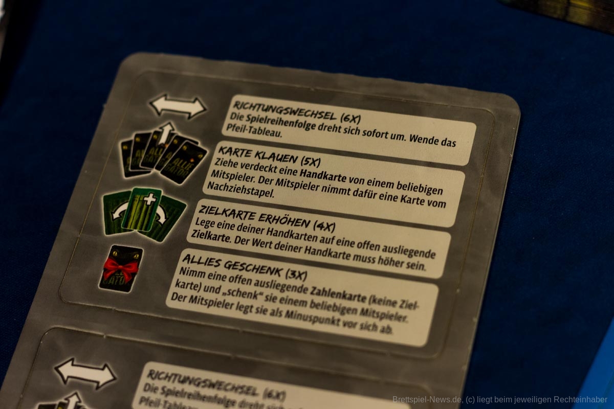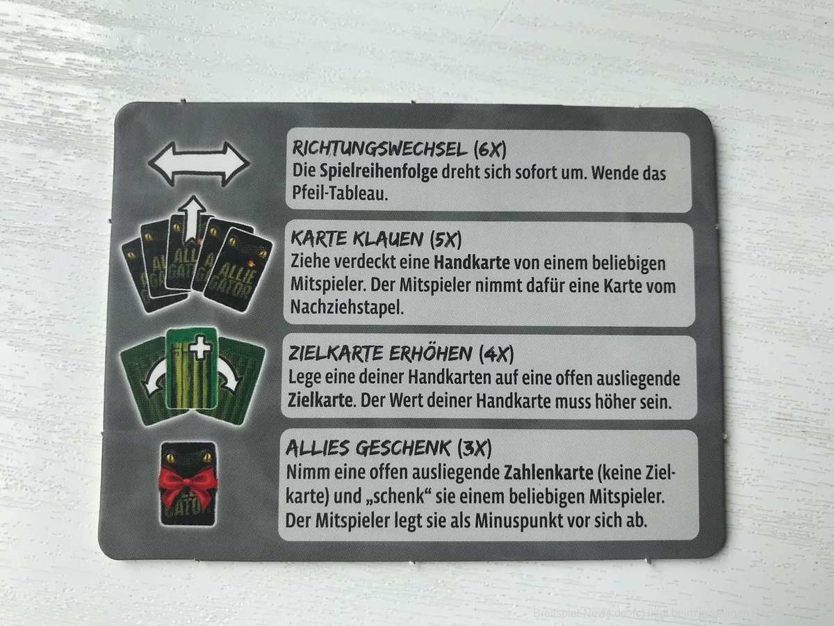 Es gibt Zahlenkarten mit den Werten 1 bis 70, sowie vier Arten von Sonderkarten in drei- bis fünffacher Ausführung: Richtungswechsel, Karte klauen, Zielkarte erhöhen und Allies Geschenk. Nachdem jede Person fünf Karten auf die Hand genommen hat, werden die zwei obersten Zahlenkarten vom Nachziehstapel aufgedeckt und nebeneinander auf den Tisch oder halt auf den aufgeklappten Deckel des Spiels gelegt. Über die linke Startkarte kommt der Allie-Gator-Chip und los geht´s.