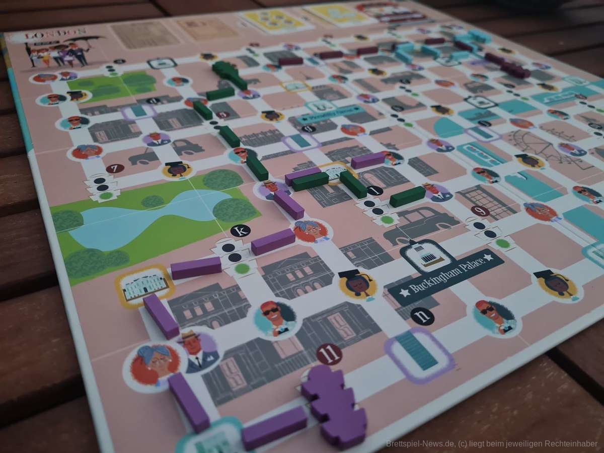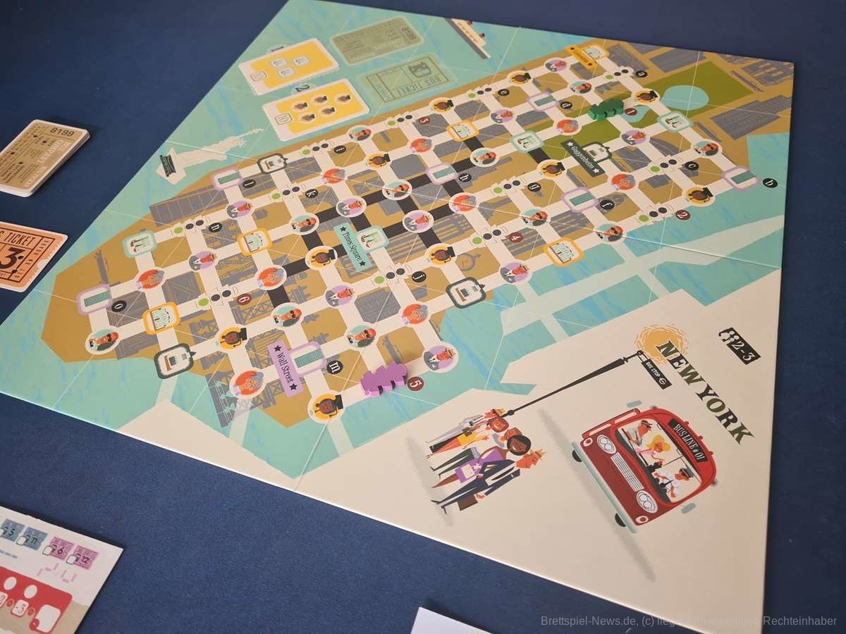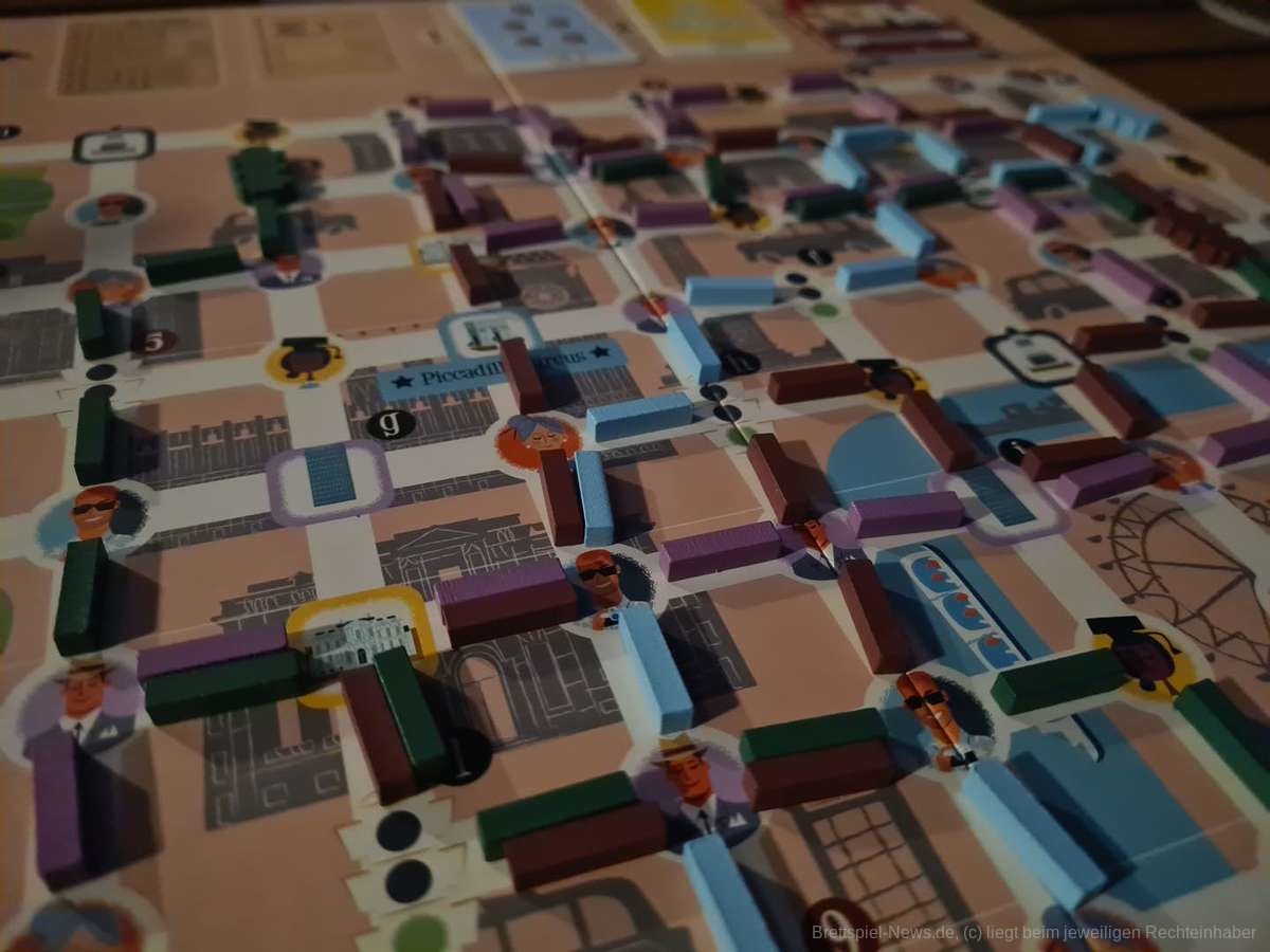 Die vielen Details im Spiel ermöglichen unterschiedliche Strategien, die den Glücksfaktor teilweise komplett herausnehmen können und damit immer wieder neue Ansätze bieten. Ganz besonders hat uns gefallen, dass „Get on Board“ unterschiedliche Spielfelder für unterschiedliche Spielgruppen-Größen anbietet. Spielen nur zwei bis drei Personen mit, findet das Spiel in New York statt, das ebenfalls seine eigenen kleinen Sonderregeln mit sich bringt. Besteht die Spielgruppe aus vier oder fünf Personen, wird in London gespielt und der Piccadilly Circus und der Buckingham Palace besucht.