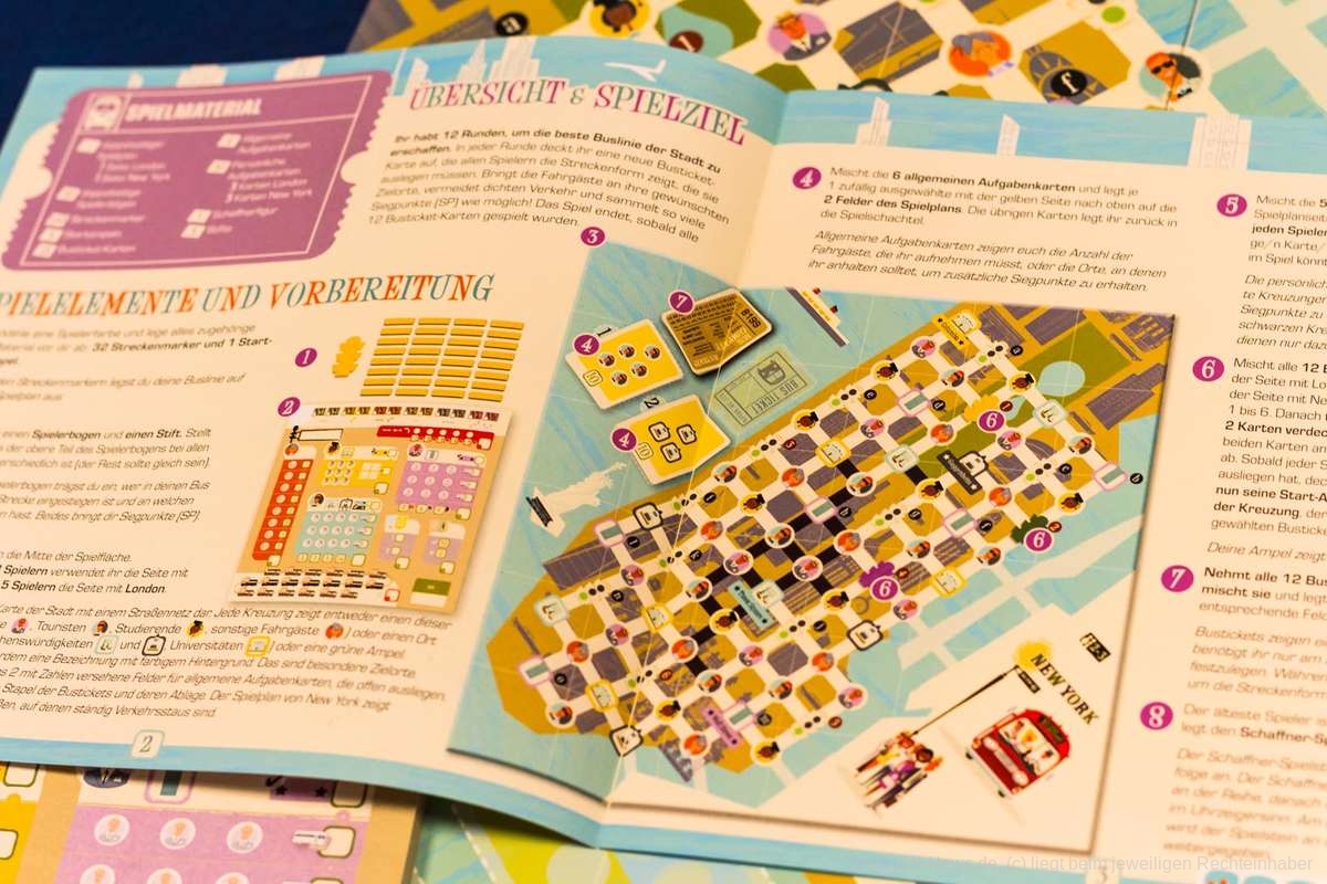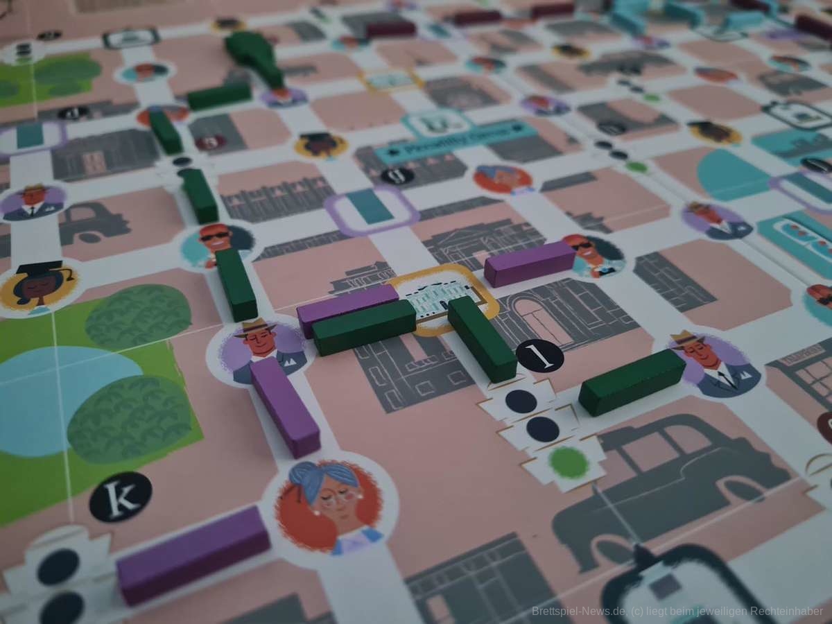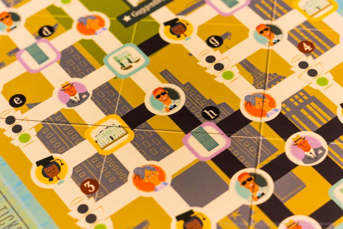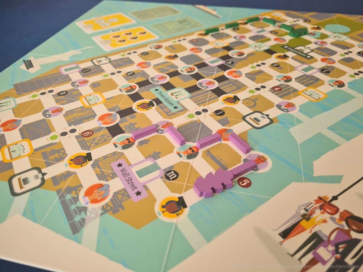 Die vielen Details im Spiel ermöglichen unterschiedliche Strategien, die den Glücksfaktor teilweise komplett herausnehmen können und damit immer wieder neue Ansätze bieten. Ganz besonders hat uns gefallen, dass „Get on Board“ unterschiedliche Spielfelder für unterschiedliche Spielgruppen-Größen anbietet. Spielen nur zwei bis drei Personen mit, findet das Spiel in New York statt, das ebenfalls seine eigenen kleinen Sonderregeln mit sich bringt. Besteht die Spielgruppe aus vier oder fünf Personen, wird in London gespielt und der Piccadilly Circus und der Buckingham Palace besucht.
