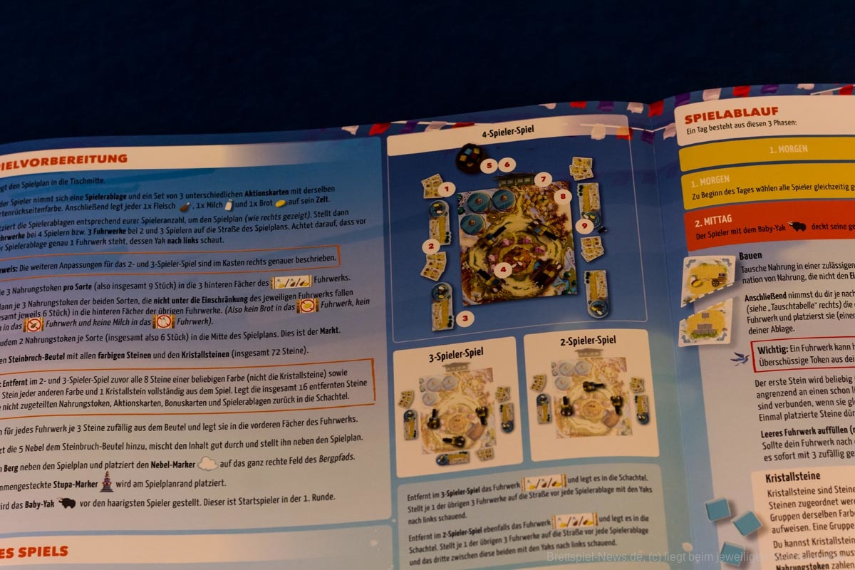 Auf den ersten Blick sieht „Yak“ recht simpel aus. Die Spielregeln sind schnell gelesen und gut verständlich. Mich hat aber zunächst direkt die Gestaltung des Spielmaterials überzeugt. Die Thematik ist mehr als liebevoll und passend umgesetzt, mit viel Liebe zu Details. Die Steine und Nahrung aus Holz, der liebevoll gestaltete Spielplan oder auch die Yaks, welche die Wagen ziehen - hier passt alles zusammen. Der Wertungsblock hilft auf alle Fälle bei der Wertung, aber ich muss gestehen – hier musste ich zweimal schauen, wo ich was eintrage. Mit der Anleitung und der Erklärung zur Punktevergabe hat es dann aber doch geklappt und bei der zweiten Partie ging es direkt auch einfacher.