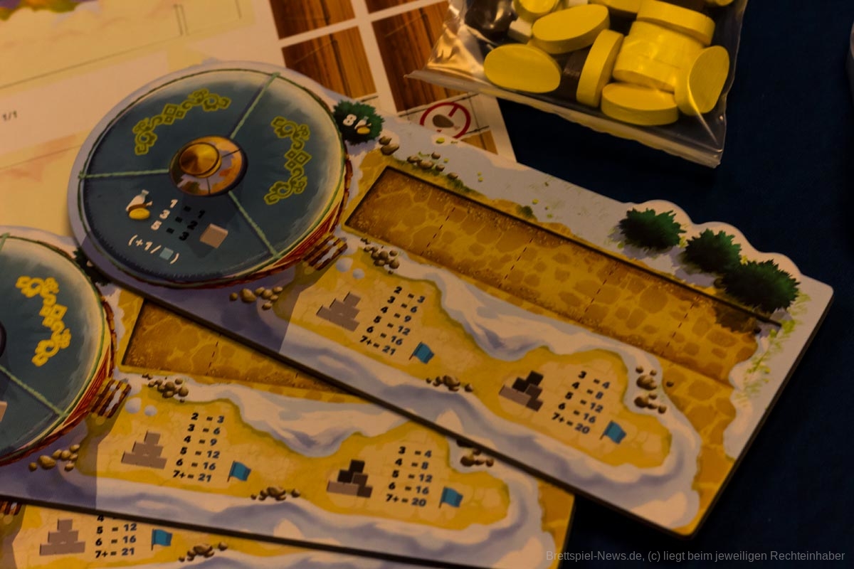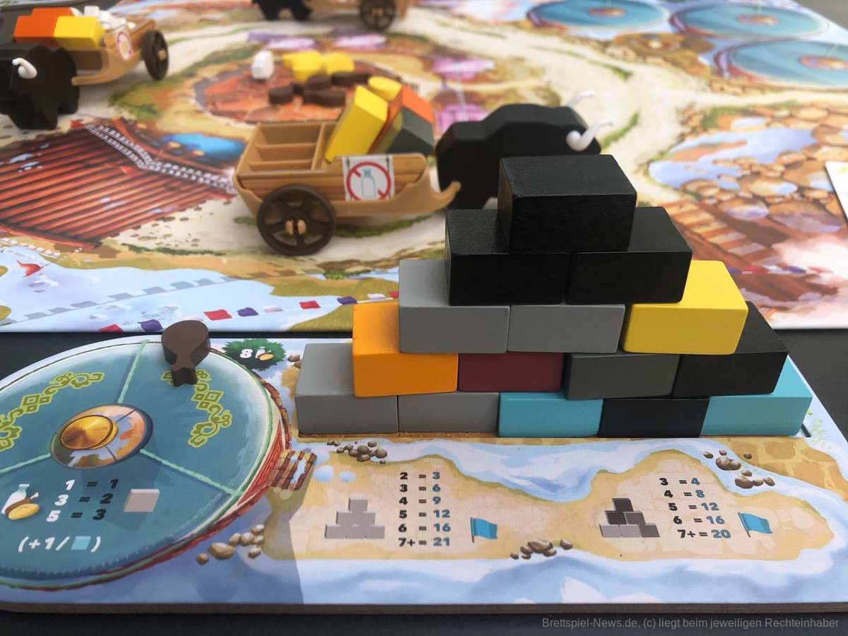 Die Yaks sind in die andere Richtig weiter und ich blieb mit meinem Brot allein. Gerade wenn mehrere Personen mitspielen, werden die passenden Steine früher weggeschnappt – welcher Stein aus dem Steinbruch wieder auf den Wagen gelegt wird steht auch in den Sternen. Ihr seht … alles gar nicht so einfach. Die Aktionen sollten daher wirklich gut durchdacht sein und man sollte die Farbauswahl der Mitspielenden gut im Auge haben, von jeder Farbe gibt es schließlich nur acht Steine.
