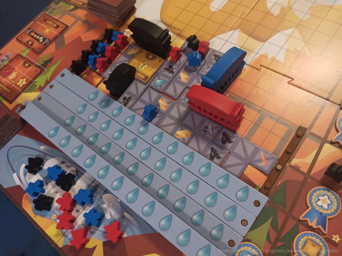 Spielerisch haben wir in „Voll Dampf“ eine Mischung aus Worker-Placement, Ressourcen-Management und Plättchenlege-Spiel. Keiner dieser Mechanismen ist wirklich neu, dennoch ergibt sich doch ein neues, unverbrauchtes Spielgefühl.