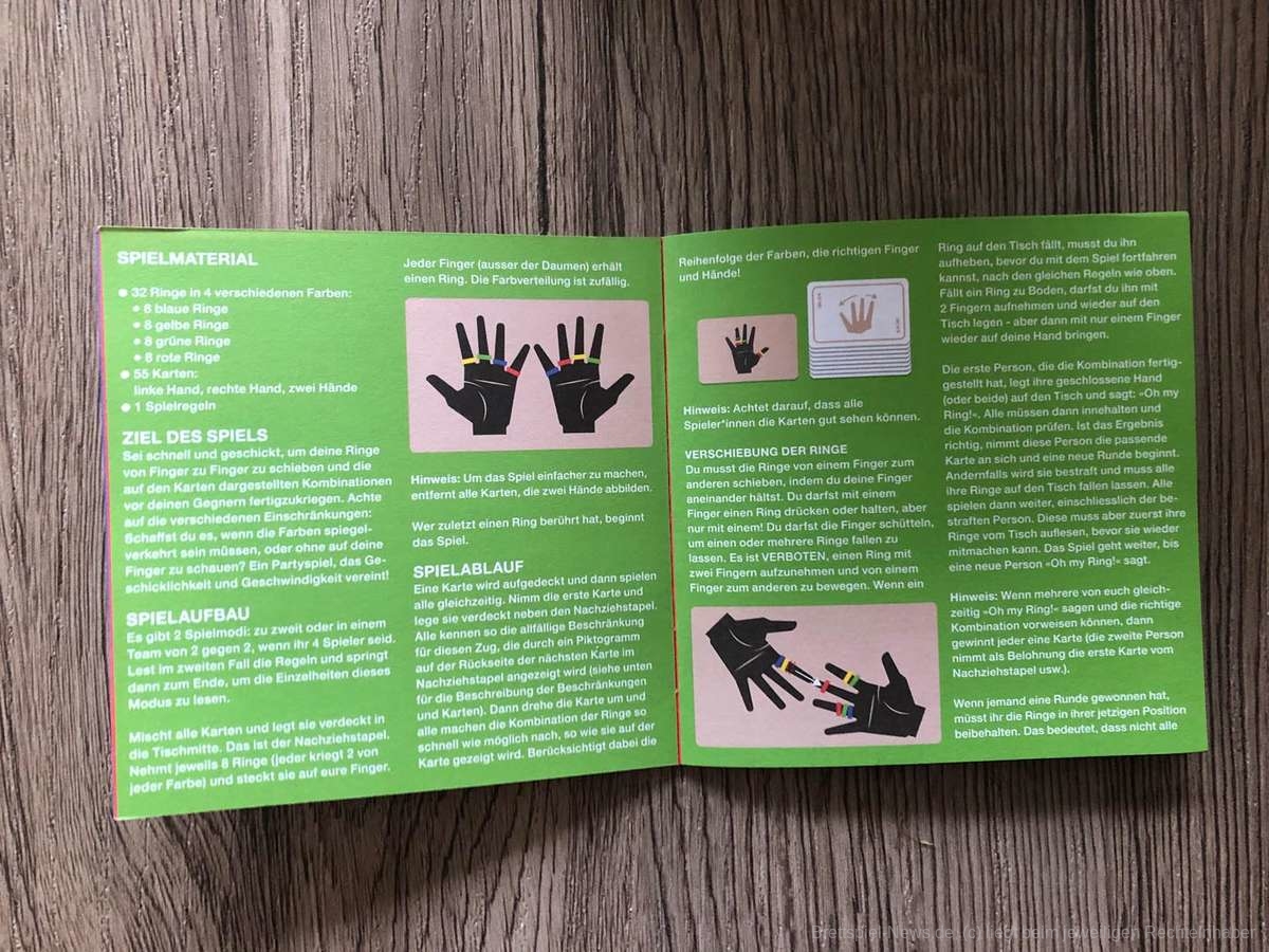 Das Ringe sind aus Holz und so groß, dass alle Fingertypen bequem reinpassen. Die Aufgaben sind von leicht bis schwierig und in den ersten Runden ist es völlig in Ordnung die Extra Anweisungen wegzulassen. Wir haben dies gemacht, da wir schon mit den normalen Aufgaben gut bedient waren. Ist es die linke Hand, oder die rechte? Schon diese Basisaufgaben und das Verschieben der Ringe haben unsere volle Konzentration verlangt.
