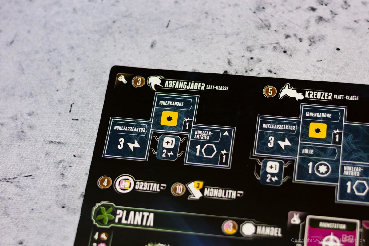 Ebenfalls eine schöne Knobelei sind für mich die Schiffs-Verbesserungen. Es macht mir unheimliche Freude über mögliche Zusammenstellungen von Kreuzern, Abfangjägern und Raumstationen nachzudenken. Lieber defensiv und hartnäckig mit viel Panzerung und Schilden oder doch als Glaskanone mit Raketenwerfern und Kanonenrohren durch das Weltall fliegen? Das eine klingt sinnvoller, aber sechs Würfel pro Schiff im Angriff werfen? Das klingt einfach nach Spaß.