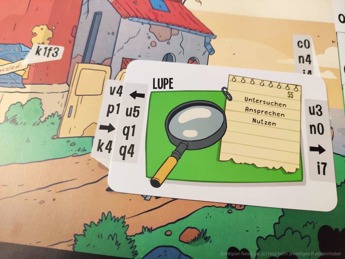 Während zu Beginn nur wenige Gegenstände im Inventar sind, kommen durch Absuchen der Orte mit der Lupen-Karte viele hinzu. Meist müssen diese in irgendeiner Form kombiniert werden, um die Story voranzutreiben. Prinzipiell werden zum Untersuchen oder Kombinieren die Karten entweder aneinandergelegt oder an die entsprechende Stelle im Bild. Ist die Kombination richtig, darf man den Text neben dem Code im Ringbuch oder auf dem beigelegten Poster lesen.