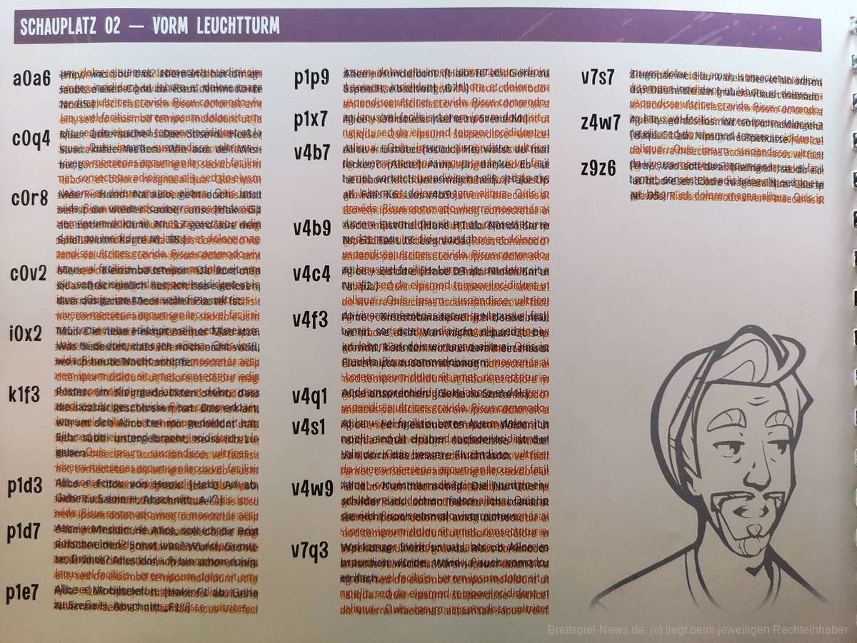 Es warten wieder viele Orte darauf, besucht zu werden, wobei einige davon erst nach einem gewissen Fortschritt zugänglich sind. Die Orte sind durchnummeriert und zeigen auf der rechten Seite des Ringbuchs ein Bild mit mehreren Interaktions-Möglichkeiten und auf der linken Seite mögliche Codes mit Text. Dieser ist rot überdruckt, sodass man ihn nur durch Anlegen der Rotfolie lesen kann. Selbiges gilt auch für Gespräche mit Charakteren, die nicht von Anfang an zugänglich sind.