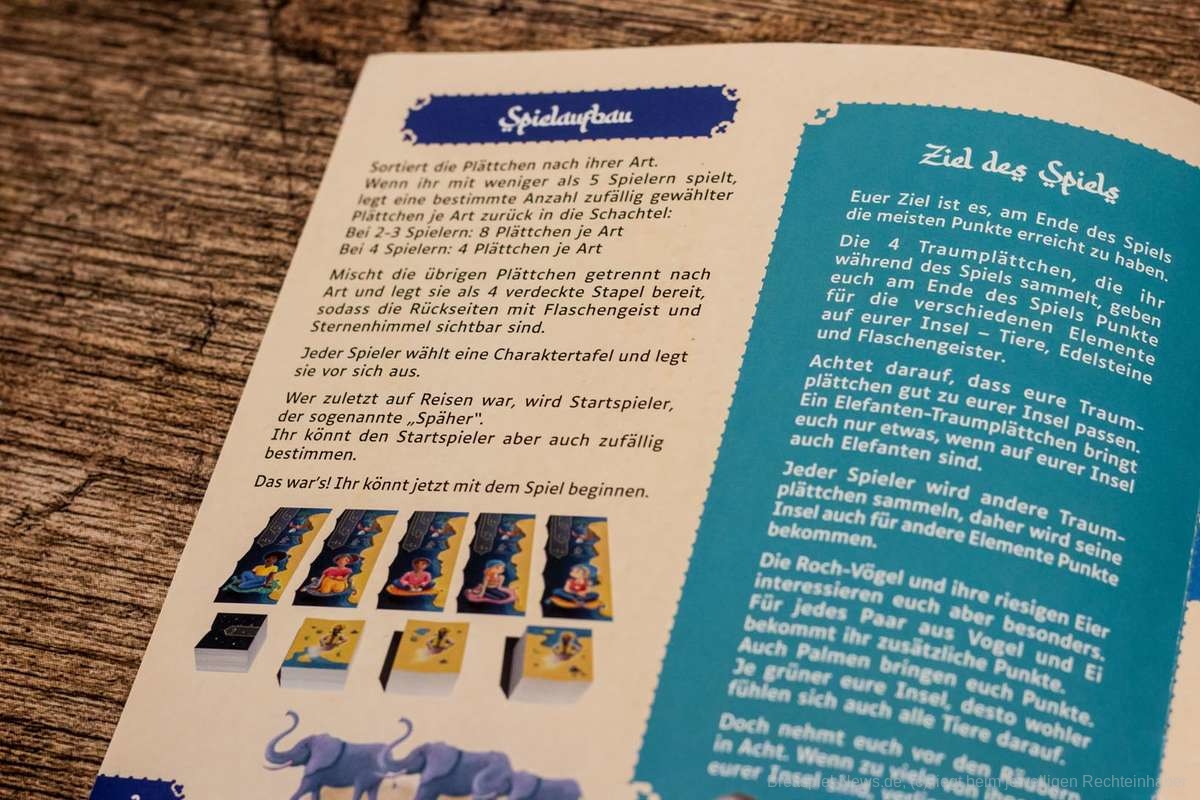 Alternativ zu den Inselplättchen darf auch vom Traumplättchen-Stapel gezogen werden. Diese Plättchen Art zeigt dem jeweiligen Kind an, für welche individuellen Tiere oder Dinge auf der Insel Zusatzpunkte ergattert werden können. Insgesamt vier dieser Traumplättchen werden bis zum Ende des Spiels an jeder Insel angelegt. Zudem müssen am Ende des Spiels alle Inseln aus drei Reihen mit jeweils vier Spalten bestehen.