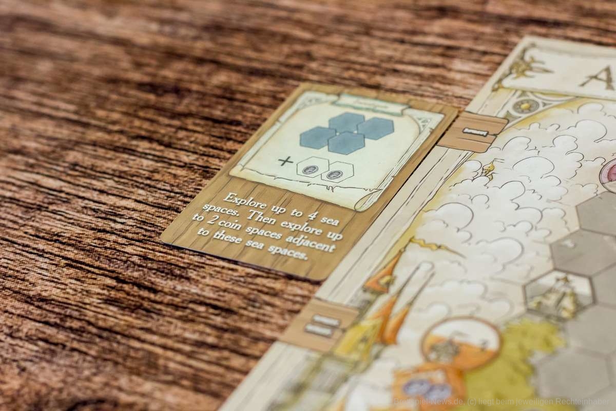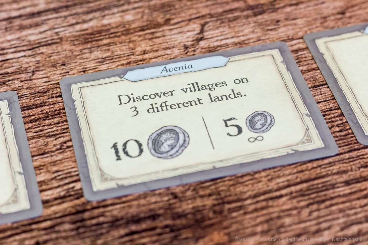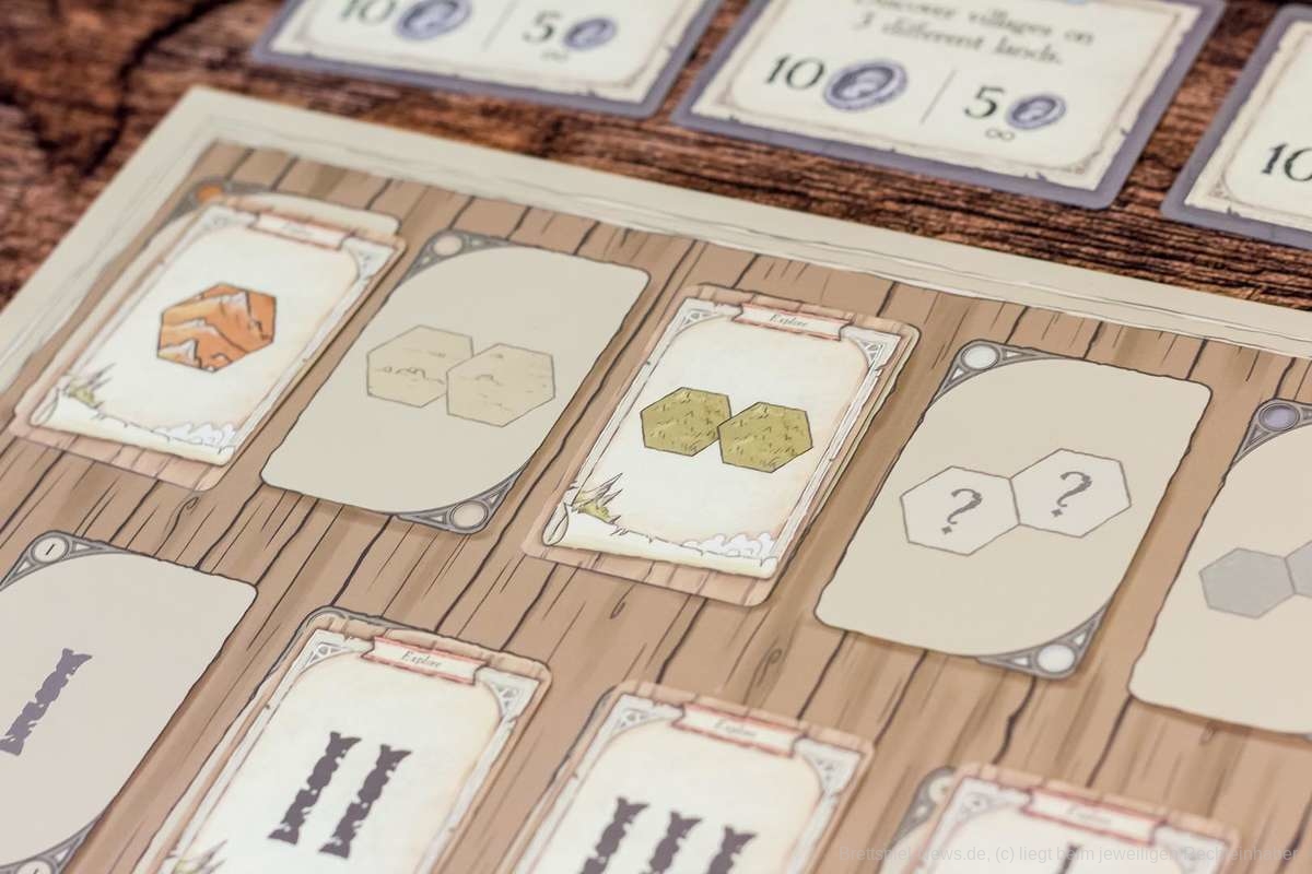 Zum Spielbeginn besteht das Kartendeck der Erkundungskarten aus sechs Karten, die für alle die gleichen Optionen bieten. So können Grasland, Wüste, Meere und Berge erkundet werden. Dies passiert meistens recht zielgerichtet, denn wir wollen als Händler Geld verdienen. Dieses liegt tatsächlich hier und da in der Landschaft verteilt herum. Es warten aber auch Schätze, Türme und Handelsposten, die erschlossen werden wollen.
