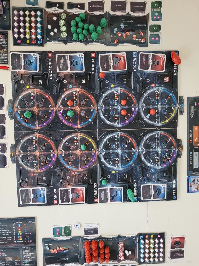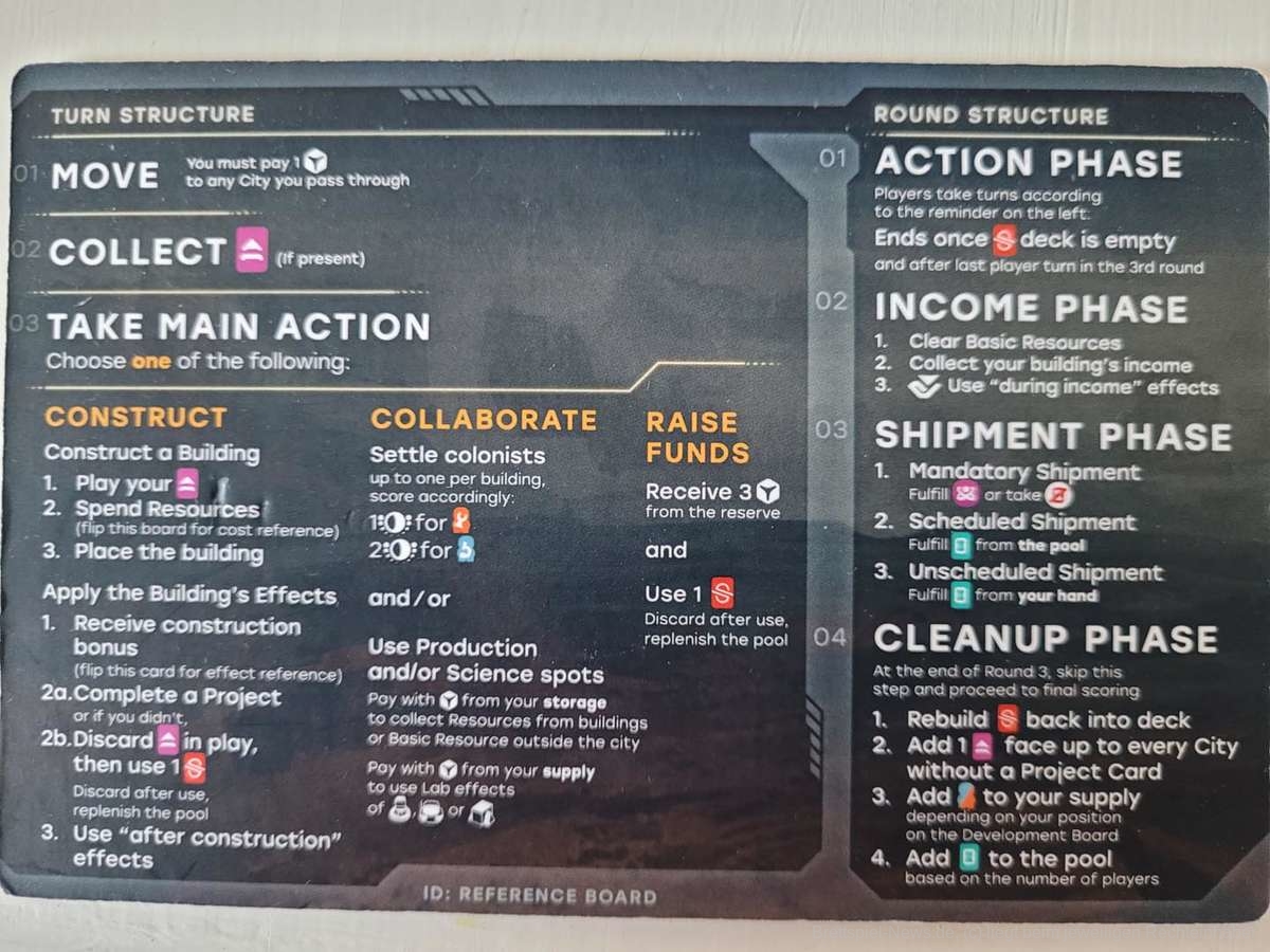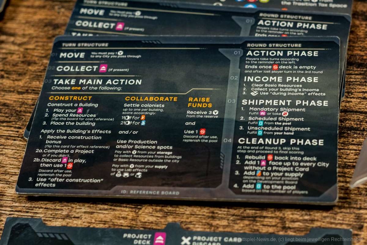 Aktionsphase: In der Aktionsphase wird zunächst das Raumschiff, welches Carrier genannt wird, bewegt. Die Raumschiffe können sich orthogonal von Stadt zu Stadt fortbewegen. Zu jeder Stadt wird eine Projektkarte ausgelegt, welche die Person erhält, die dort den Carrier platziert. Zuletzt können verschiedene Aktionen getätigt werden: