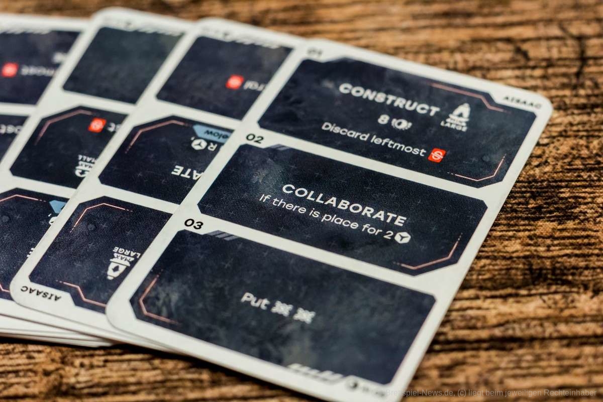 Zusammenarbeiten: Hierbei darf die aktive Person Ingenieure oder Wissenschaftler den entsprechenden Feldern der gebauten Gebäude zuordnen. Jeder eingesetzte Ingenieur ist sofort einen und jeder Wissenschaftler zwei Siegpunkte wert. Anschließend produzieren alle eingesetzten Arbeiter der Stadt die entsprechenden Ressourcen. Jede produzierte Ressource kostet zusätzlich einen Qubit, welcher die Produktion des Feldes für diese Runde blockiert.