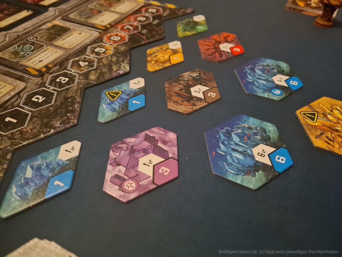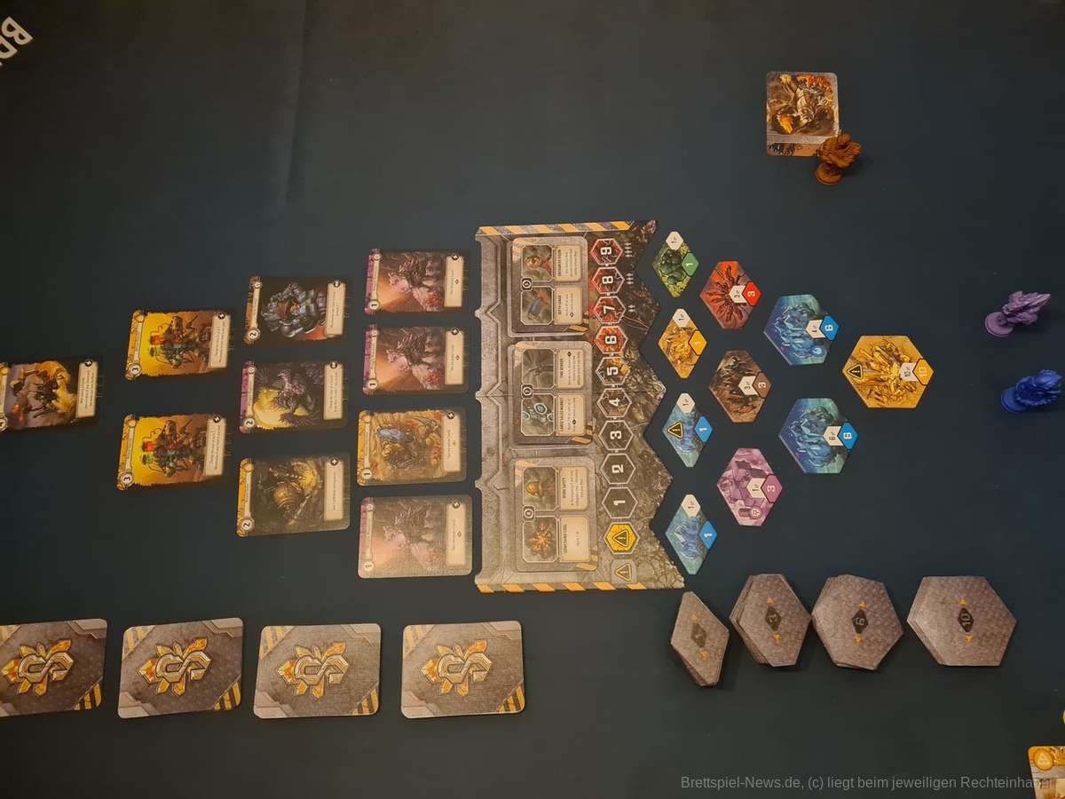 Da ich im Herzen ein Zwerg bin, sprach das Thema von „Cave-In“ direkt zu mir. Immer tiefer in die Erde vorzudringen, um Reichtümer ans Tageslicht zu bringen, funktioniert immer. Ob das jetzt im Weltall oder in einem Fantasiereich stattfindet, ist dabei erst einmal egal. Das grundsätzliche Gefühl, sich tiefer in die Erde zu bohren, gelingt „Cave-In“ recht gut. Während zunächst nur kleine Kristalle und schwache Karten aufgenommen werden können, geht es mit der Zeit und genügend Vorbereitung immer tiefer hinab, wo die großen Schätze warten.