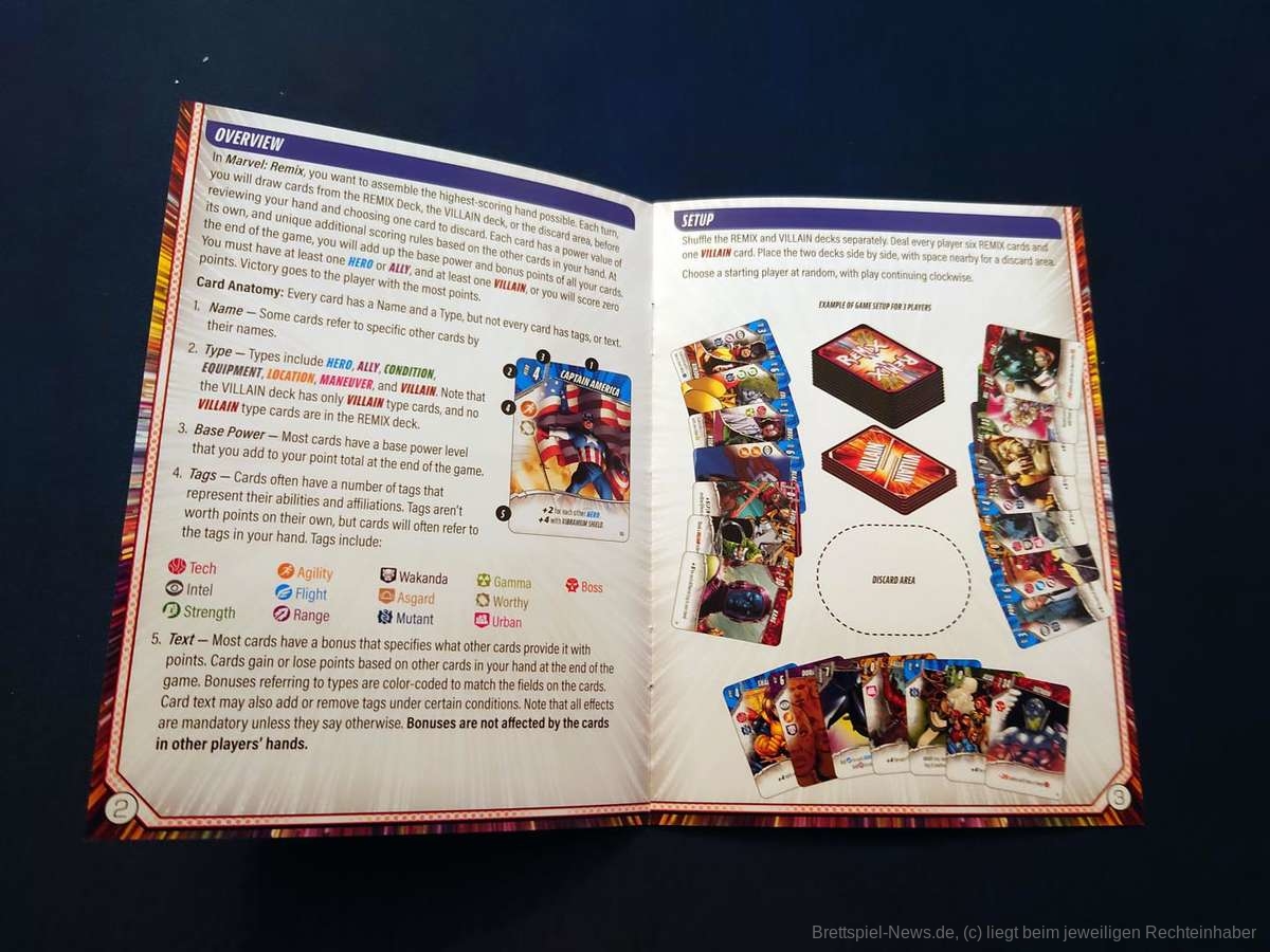 „Marvel Remix“ ist für alle, die schon mal „Fantastische Reiche“ gespielt haben, sofort verständlich. Aber auch für komplette Neueinsteiger ist es sehr eingängig. Die Übersicht über die verschiedenen Schlagwörter im Regelheft ist dabei eine nette kleine Stütze in der ersten Partie.