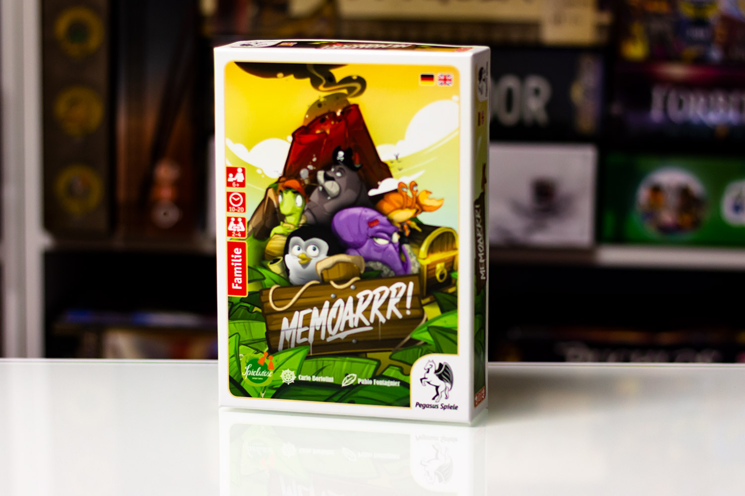 Memory: Seit dem 12 Jahrhundert in Japan als „Kai-Awase“ bekannt, seit dem 19. Jahrhundert als „Pairs“ in England und den USA beliebt und seit nunmehr 60 Jahren bei Ravensburger patentiert. Heute gibt es eine neue Version des erprobten Klassikers, die mit wenigen cleveren Kniffen den Spielspaß explodieren lässt! Die Rede ist von Carlo Bortolinis „Memoarrr!“. Die Memory-Neuauflage, welche 2017 beim Pegasus Verlag erschienen ist, versetzt zwei bis vier Gedächtniskünstler ab 6 Jahren in kurzweilige Partien, die selten länger als 20 Minuten dauern. Wie Carlo Bortolini und sein Team es schaffen, dem staubigen Urgestein in der Spielekiste neues Leben einzuhauchen, verrät folgender Test.