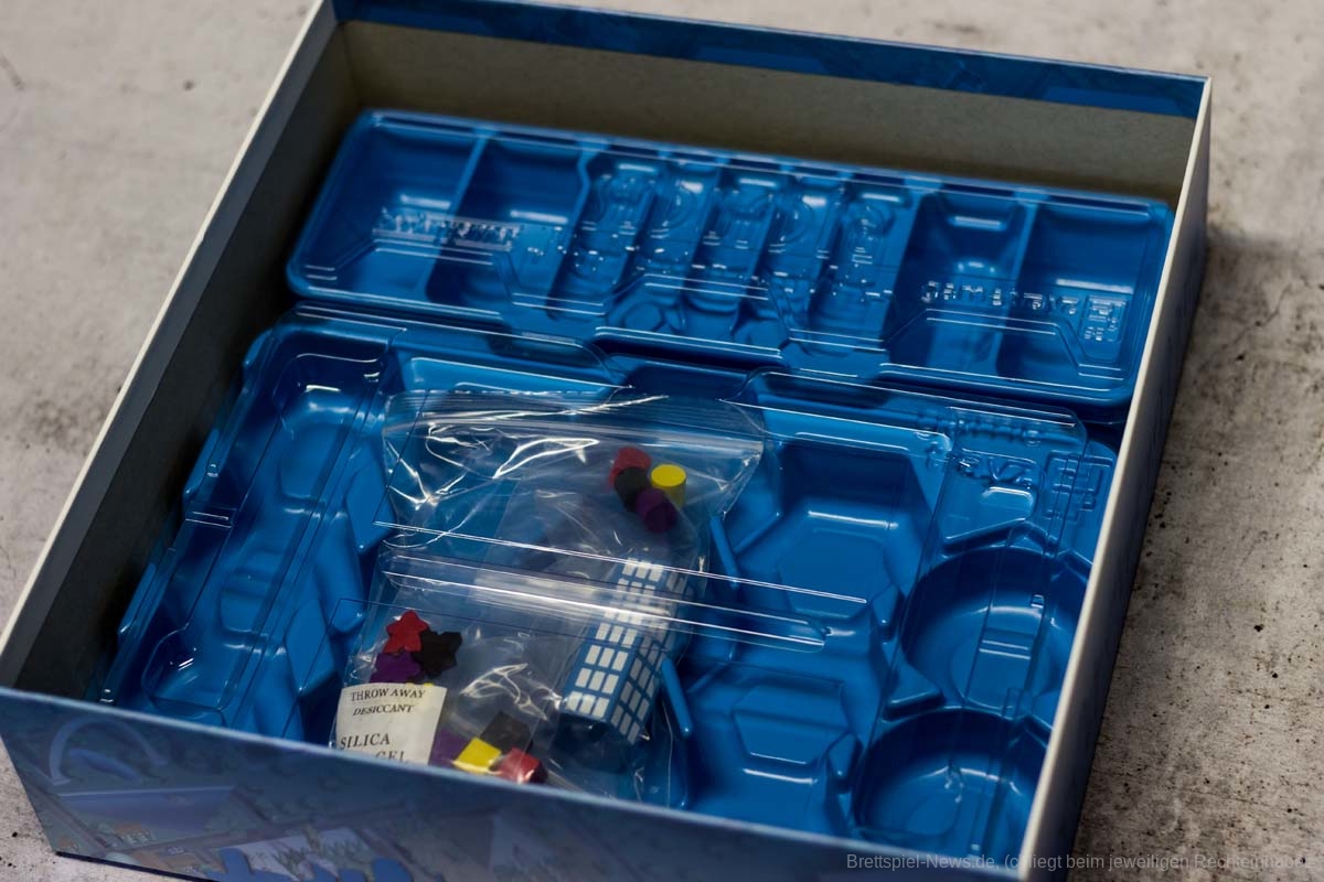 Die Plättchengröße ist gegenüber der Erstauflage sogar gewachsen. So sehe ich keinen Grund die spielrelevanten Daten zu verkleinern... Platz hätte es ja gegeben! Dem dagegen steht das wirklich gut überdachte Inlay, das jedem Plättchen und jedem Marker einen definierten Platz bietet und nichts in Zipbeuteln verpackt werden muss.