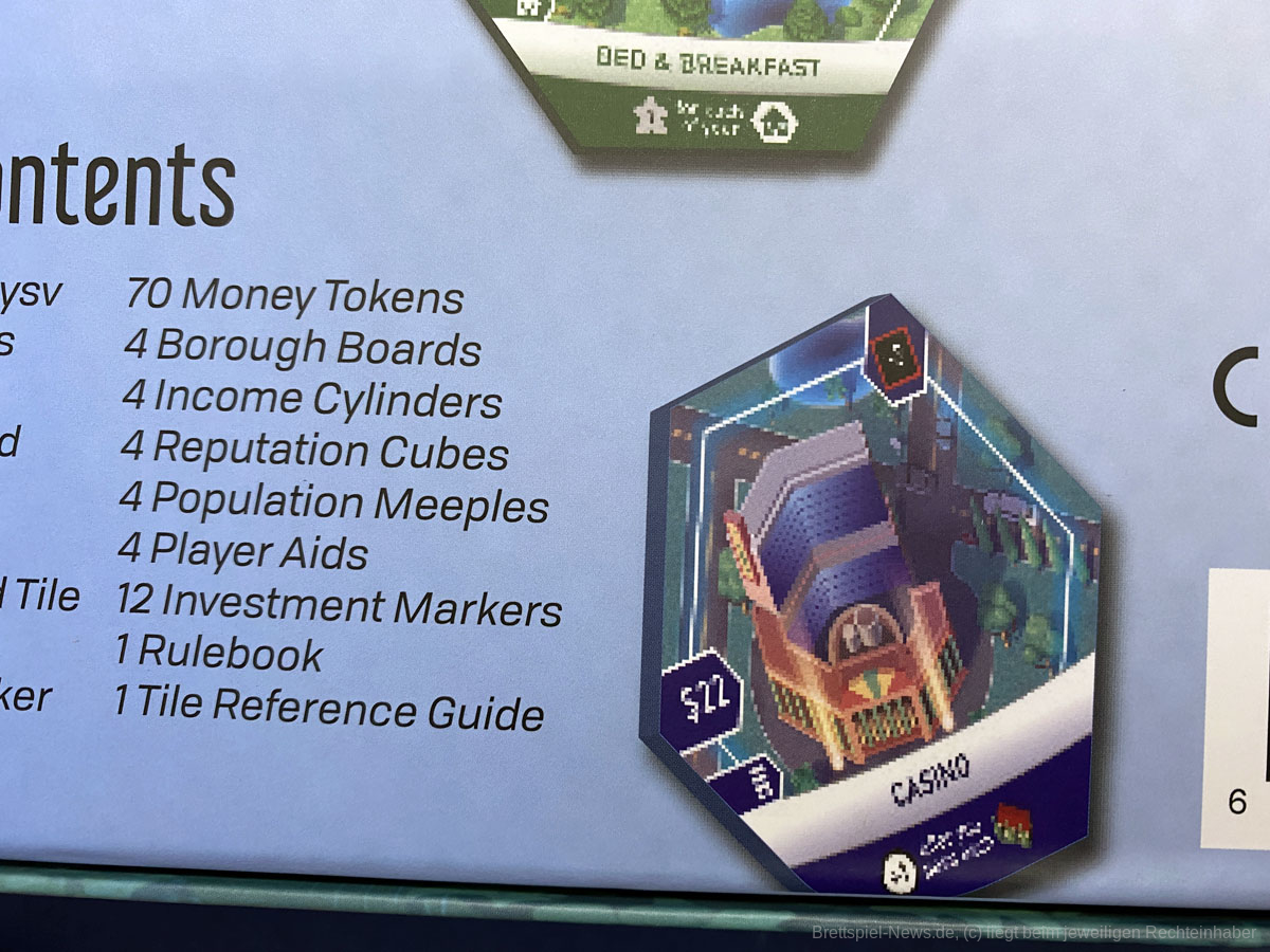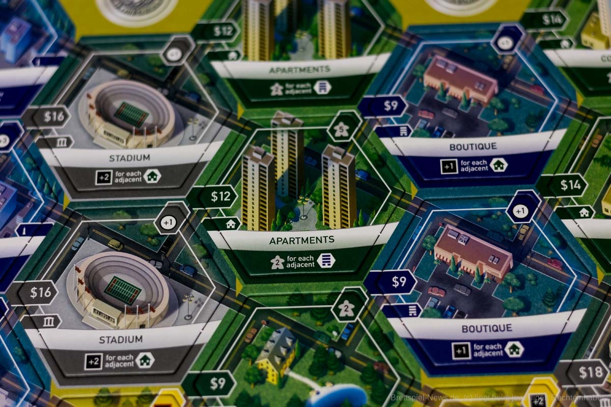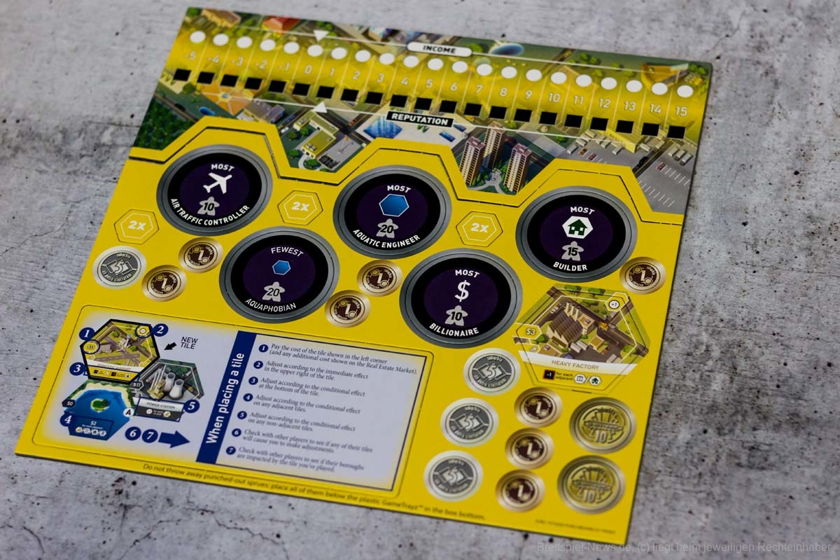 Nachdem eine der vier Optionen gewählt wurde, muss das gerade gelegte, sowie alle davon beeinflussten Plättchen, gewertet werden. Das klingt komplizierter als es ist und kann ganz einfach mit oder ohne beiliegender Spielerhilfe erledigt werden. Die Effekte geben entweder direkte Bevölkerung (Siegpunkte), Geld, einen Einkommensbonus bzw. –Malus und/oder erhöhen bzw. senken den Ruf des eigenen Stadtteils.