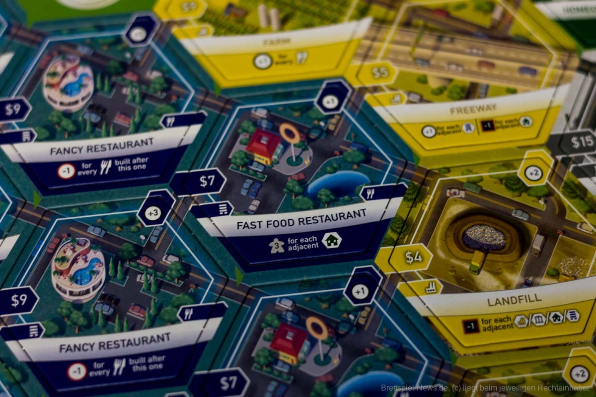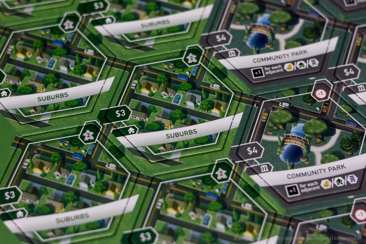 Gleich vorweg: SUBURBIA ist für mich ein grandioses Stadtbauspiel und gehört seit Jahren zu meinen TOP Titeln im Spieleschrank. Das Management zwischen Geld, Einkommen, Ruf und Einwohnern ist einfach unglaublich gut umgesetzt. Alle Plättchen haben thematischen Bezug zueinander und sind damit äußerst elegant ins Spiel integriert: Flugplätze und stinkende Industrien neben Wohngebieten lässt Bewohner ausziehen und schaden dem guten Ruf der Vorstadt. Parks schaffen Anwohnern und Gewerbetreibenden die nötige Erholung, sorgen damit für einen besseren Ruf doch schlagen negativ auf das Einkommen zu buche. Automobilverkäufer, Schulen, Gemeindehäuser... Alle haben ihre eigenen Effekte und wirken sich je nach Platzierung etwas anders aus.
