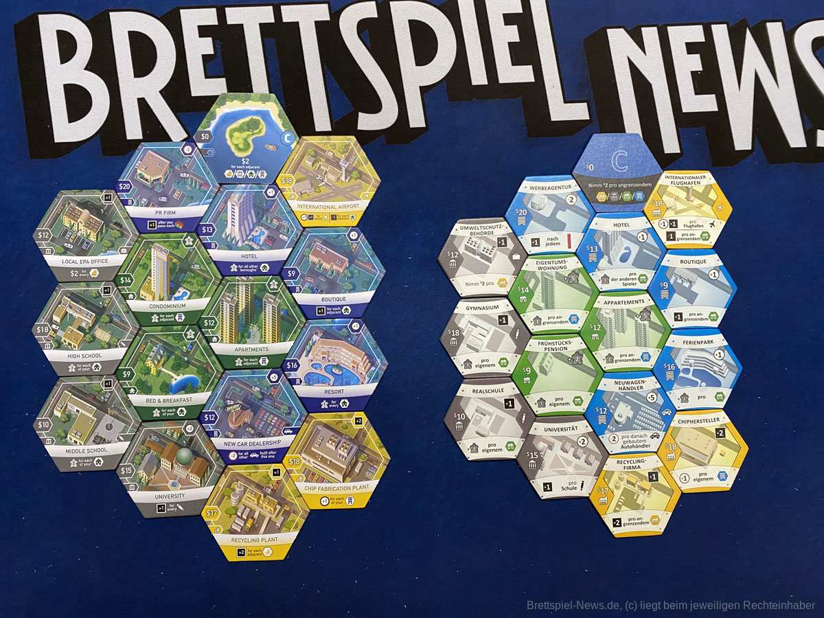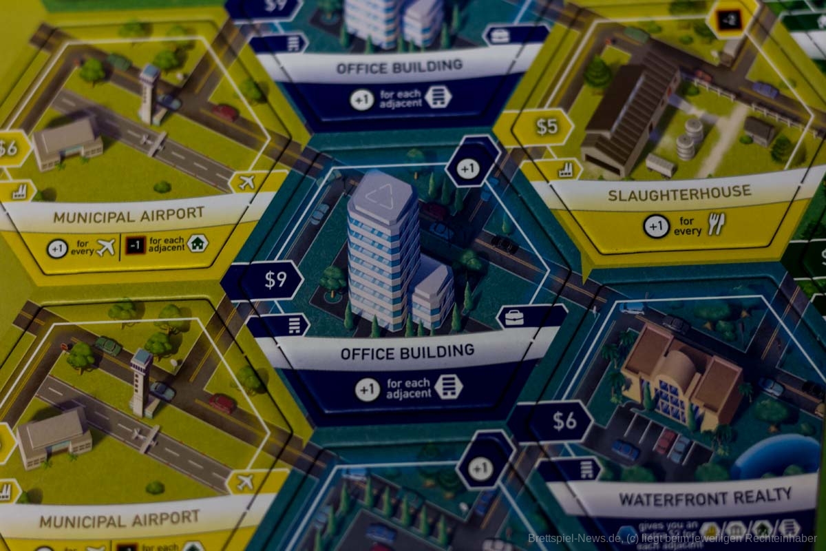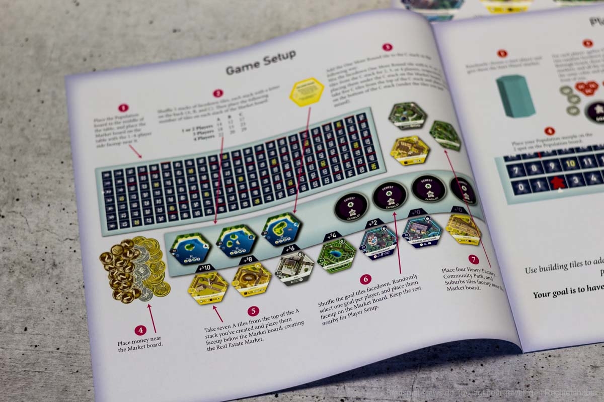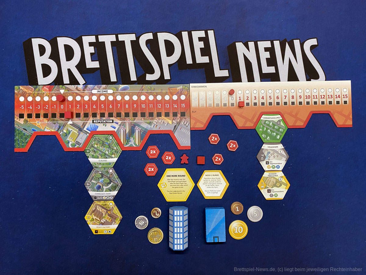 Der Spielaufbau ist überschaubar und schnell erledigt. Je nach Spieleranzahl werden aus den „A“-, „B“- und „C“-Stapeln eine Anzahl zufälliger Plättchen gezogen und auf dem zentralen Spielbrett aufgeschichtet. Hinzu kommen offene Aufträge und die Plättchen der drei Standard-Gebäude. Die Spielenden starten mit einem Wohngebiet, das zur Stadtmitte ausgerichtet liegt. Daran grenzt ein Gewerbe- und daran wiederrum - weit außerhalb der Stadtmitte - ein Industriegebiet. Für den ersten Zug muss der Immobilienmarkt aufgedeckt, ein Startspieler bestimmt, Startkapital ausgezahlt, sowie private Ziele gewählt werden. Dann kann’s auch schon losgehen.