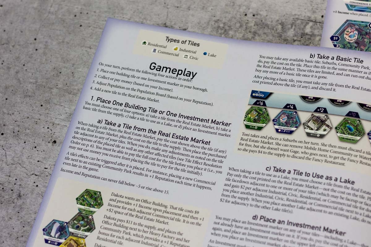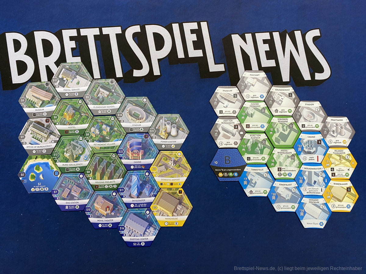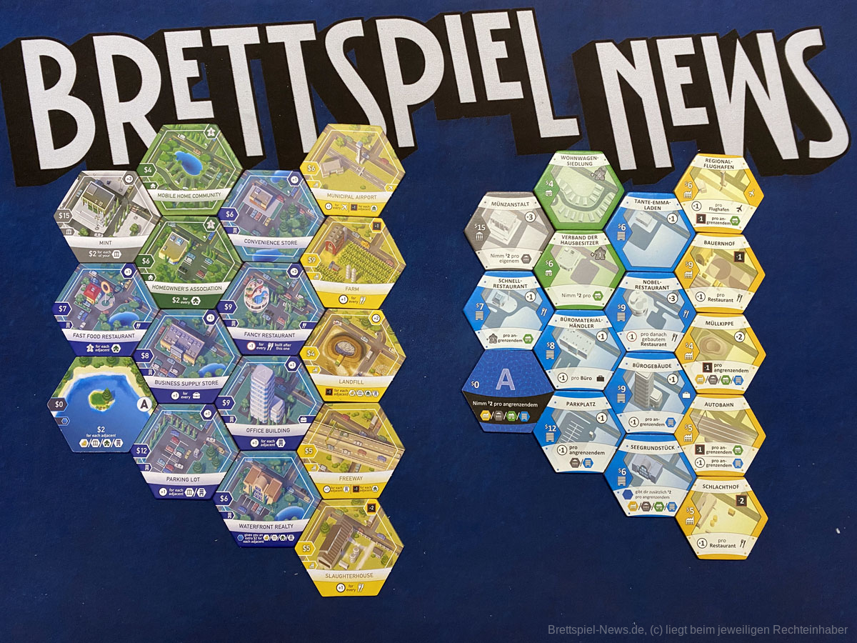 Der Spielaufbau ist überschaubar und schnell erledigt. Je nach Spieleranzahl werden aus den „A“-, „B“- und „C“-Stapeln eine Anzahl zufälliger Plättchen gezogen und auf dem zentralen Spielbrett aufgeschichtet. Hinzu kommen offene Aufträge und die Plättchen der drei Standard-Gebäude. Die Spielenden starten mit einem Wohngebiet, das zur Stadtmitte ausgerichtet liegt. Daran grenzt ein Gewerbe- und daran wiederrum - weit außerhalb der Stadtmitte - ein Industriegebiet. Für den ersten Zug muss der Immobilienmarkt aufgedeckt, ein Startspieler bestimmt, Startkapital ausgezahlt, sowie private Ziele gewählt werden. Dann kann’s auch schon losgehen.