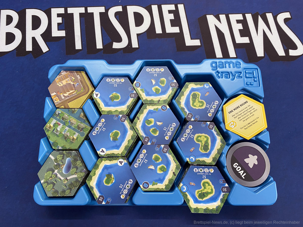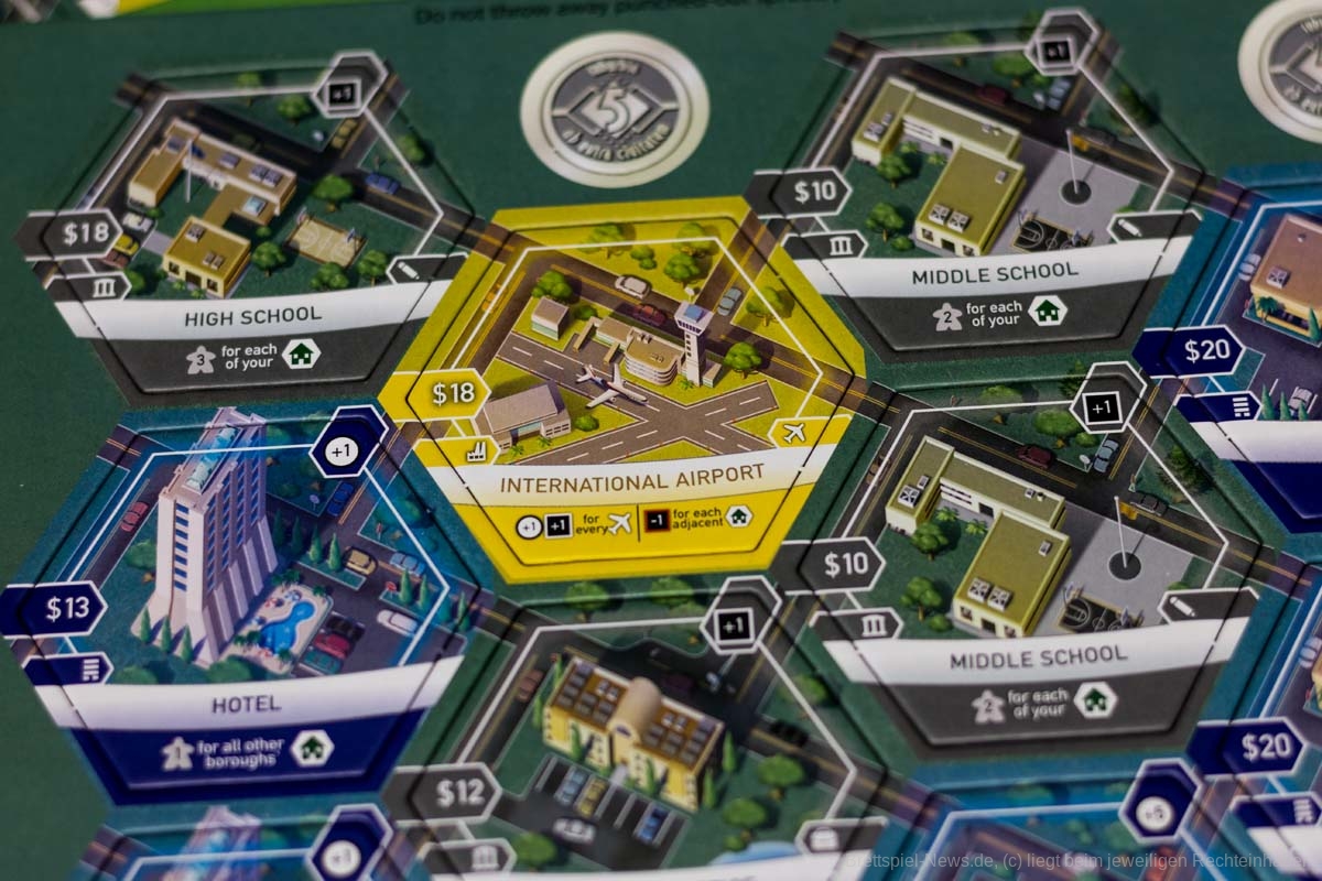 3. Ein Investitionsmarker auf ein eigenes Plättchen im Stadtbezirk legen und es damit nochmals Werten. Auch hier muss ein Plättchen aus dem offenen Immobilienmarkt entfernt werden.