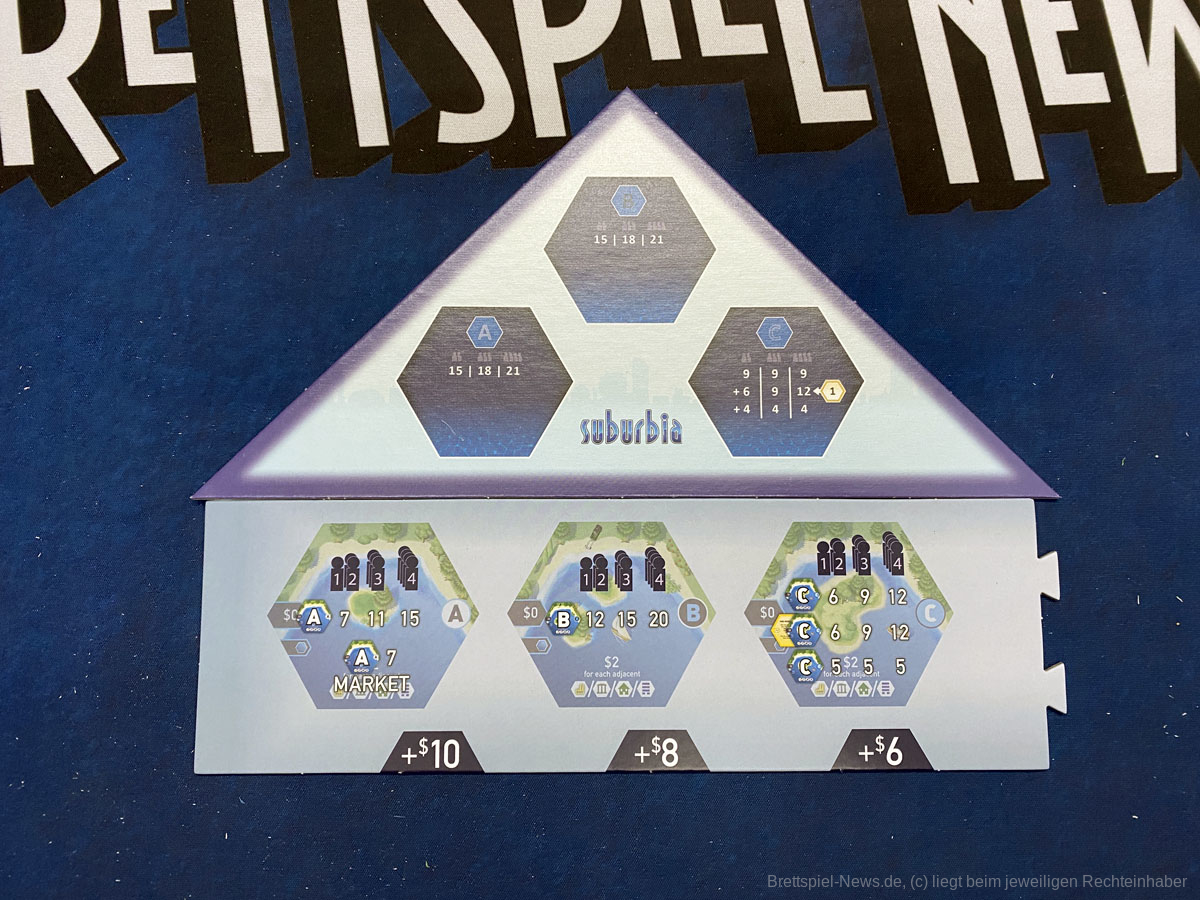 Das Spiel bringt zwei verschiedene Solovarianten mit, die sich zum Spiel gegen echte Menschen unterscheiden. In der Ersten wird ein Highscore mit etwas verschärften Strafen angestrebt. In der Zweiten kauft ein Mechanismus gesteuerter Automa im Grunde immer das teuerste Plättchen aus dem Markt und es gilt diesen Bot zu schlagen. Beide Varianten konnten mich nicht wirklich überzeugen. Ich bin auch kein großer Fan von Solopartien. Ansonsten funktioniert SUBURBIA in allen Spielerkonstellationen sehr gut, da die Menge der Plättchen und Ziele genau abgestimmt sind. Lediglich die Spielzeit erhöht sich etwas mit jedem zusätzlichem Teilnehmer.