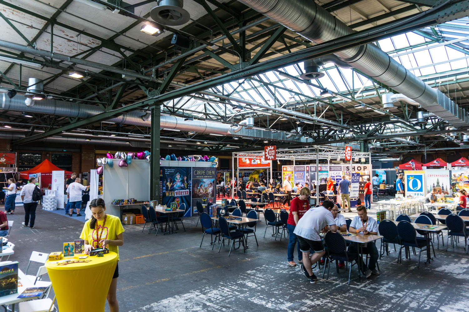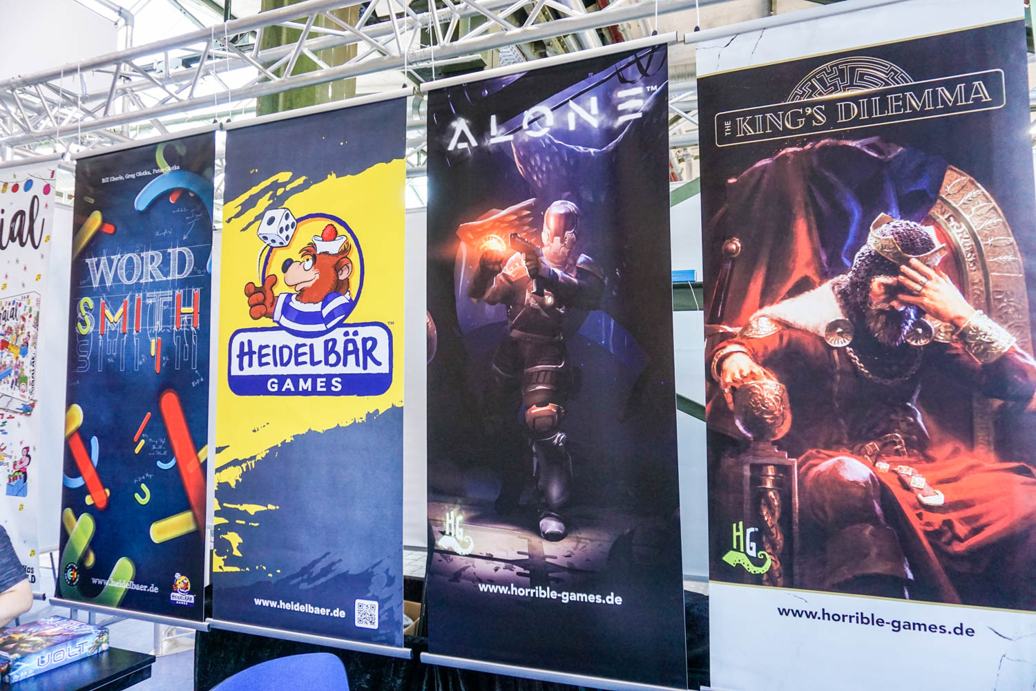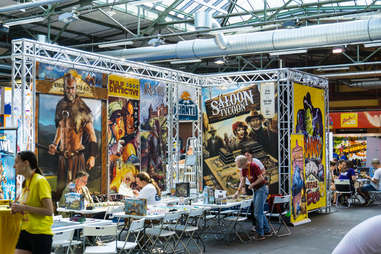 In der Halle der Aussteller konnte fleißig gespielt werden. Große Beliebtheit zeigte sich bei dem wieder verfügbaren Flügelschlag, dem auf Deutsch verfügbaren Root, dem wunderschön Illustrierten Tavernen im Tiefen Thal, dem Programmierspiel Volt und dem Kinderspiel des Jahres Tal der Wikinger uvm. Der anhaltende Trend der Roll & Write Spiele war auch auf dieser Messe präsent. Die Spieletische sowohl bei dem neuen Imperial Settlers Roll & Write als auch bei Railroad Ink. waren ständig besetzt und es wurde viel gewürfelt. Ebenfalls weiterhin ein großes Thema sind die Deduktionspiele wie Detective, Mythos Tales, Sherlock, Adventure Games, Exit, Undo und Chronicles of Crime… – mit dieser Spielekategorie lassen sich auch Nicht- bzw. Wenigspieler mehr und mehr für das Hobby begeistern. Die Bilder zeigen die Verlage mit den präsentierten Spielen.