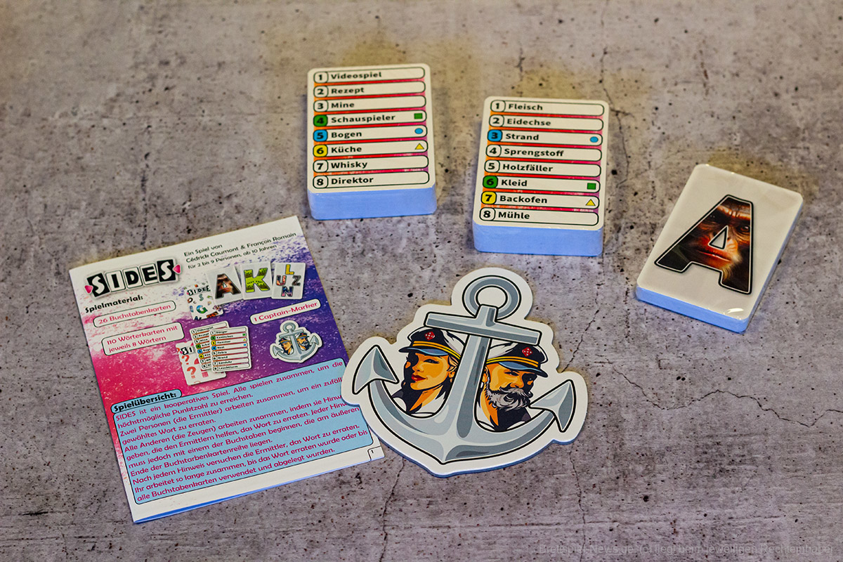 Eine Partie „Sides“ spielt sich schnell und einfach. In diesem kooperativen Partyspiel geht es darum möglichst viele Punkte zu machen. Eine Person wird Kapitän oder Kapitänin. Sie sagt eine Zahl von 1-8 und alle anderen am Tisch sehen sich auf einer geheimen Karte das zu ratende Wort an. In der Tischmitte liegen sieben Karten mit Buchstaben.