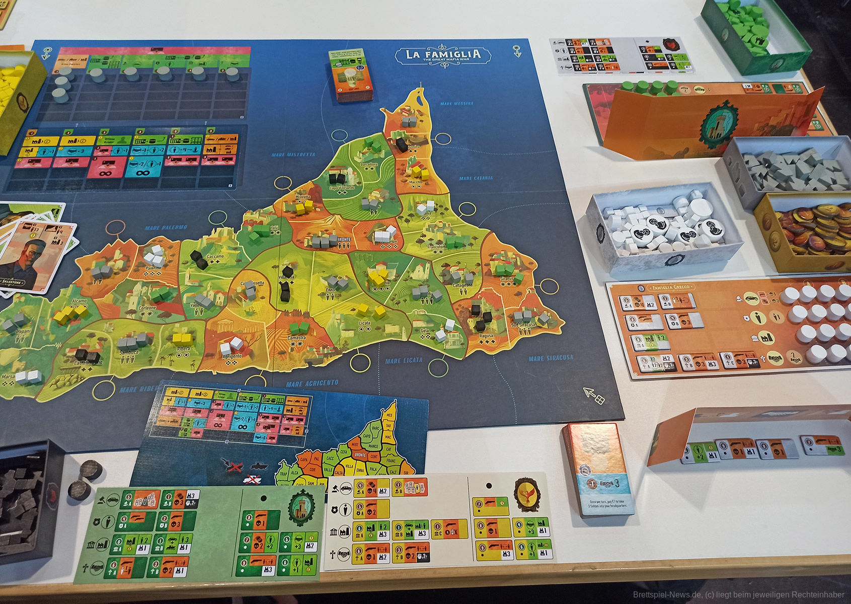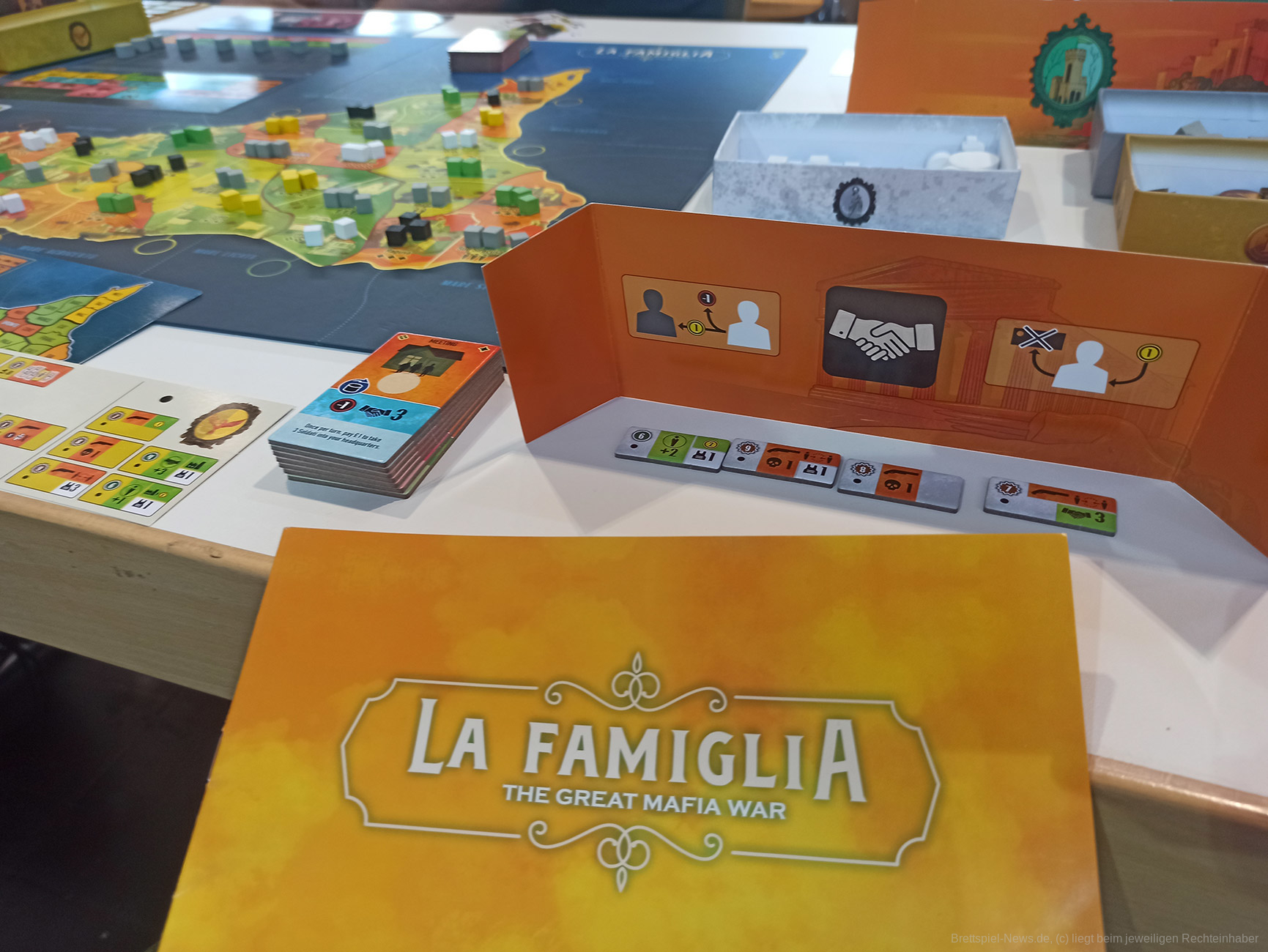 „La Famiglia“ ist ein Area Control Spiel und spielt auf Sizilien, wo verfeindete Mafia-Familien um die Vorherrschaft kämpfen. Immer zwei Mafia-Familien verbünden sich und spielen im Team, gegen die anderen beiden verbündete Mafia-Familien. Jede Runde teilt sich in zwei Phasen auf. In der Planungsphase sprechen sich die verbündeten Parteien ab und planen Ihre Spielzüge, indem sie Regionen aufrüsten und geheime Aufträge verteilen, die es ermöglichen angrenzende Gebiete anzugreifen. Dabei ist die Aktionsauswahl ungewohnt, innovativ und sorgt bereits für Interaktion.