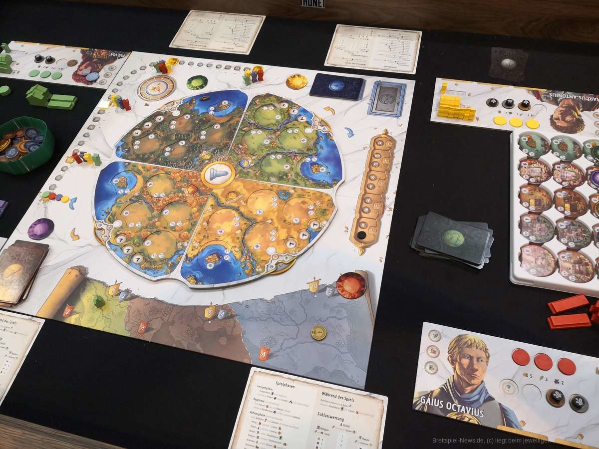 Wir repräsentieren römische Feldherren (oder deren Frauen) die kurz nach der Ermordung Cäsars im Jahre 44 v. Chr. darum kämpfen, in die Fußstapfen des verstorbenen Kaisers zu treten. Wer sich als bester Provinzverwalter etabliert, soll Cäsars Nachfolge antreten. Die Mitspielenden geben Geld aus um jede Runde in einem Viertel des Drehtellers Aktionsfelder auszubauen. Für jede Stufe (I bis III) der fünf - anfangs identischen - Bauplätze erhalten sie zwar Siegpunkte, allerdings wird am Ende jeder Runde das Rondell um eine Vierteldrehung nach links oder rechts gedreht. Nachdem alle Aspiranten ihre Bauplätze ausgebaut haben, können sie einen Arbeiter auf die für sie verfügbaren Felder platzieren. Maximal ein Arbeiter darf auf Stufe I-Felder, zwei Arbeiter auf Stufe-II-Felder und dementsprechend bis zu drei Arbeiter auf der höchsten Stufe eines Aktionsfelds.