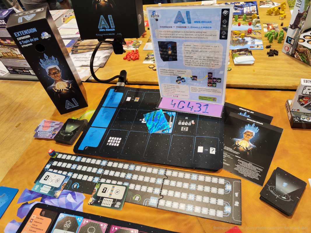 Ein Crowdfundingprojekt, welches noch nicht ausgeliefert ist, kann auf der diesjährigen Spiel sowohl ausprobiert, als auch erworben werden. Thematisch dreht sich das Kartenspiel um die Erschaffung der eigenen künstlichen Intelligenz. AI: 100% Human bietet Drafting und Hand Management-Anteile und richtet sich an 1 bis 6 Spieler mit einer Spieldauer von 30 bis 45 Minuten.