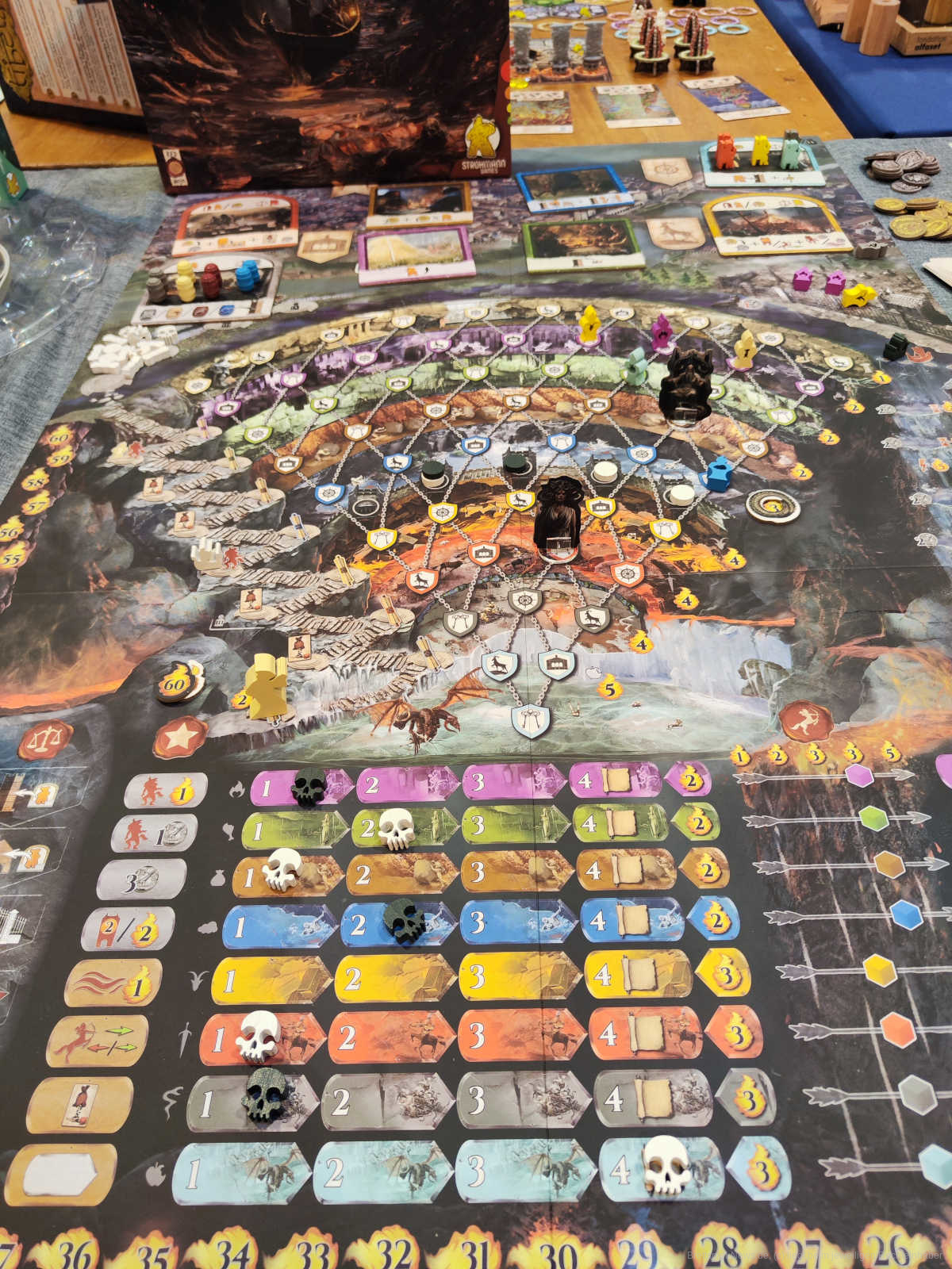 Inferno punktet beim ersten Hinschauen direkt mit seiner opulenten Tischpräsenz. Dabei fällt besonders die Visualisierung der 9 Kreise der Hölle ins Auge. Generell ist die thematische Umsetzung des Spiels meiner Meinung nach extrem gut gelungen, obwohl das Thema auch einen makaberen Beigeschmack besitzt. Besonders freue ich mich bei dem Spiel auf den Tabletalk, wenn wieder ein Spieler einen Menschen in Florenz „beschuldigt“ und dann seine Seele in die Hölle schickt. Das Spielmaterial ist einfach gehalten, bietet dadurch aber eine extrem gute Übersicht über den großen Spielplan.