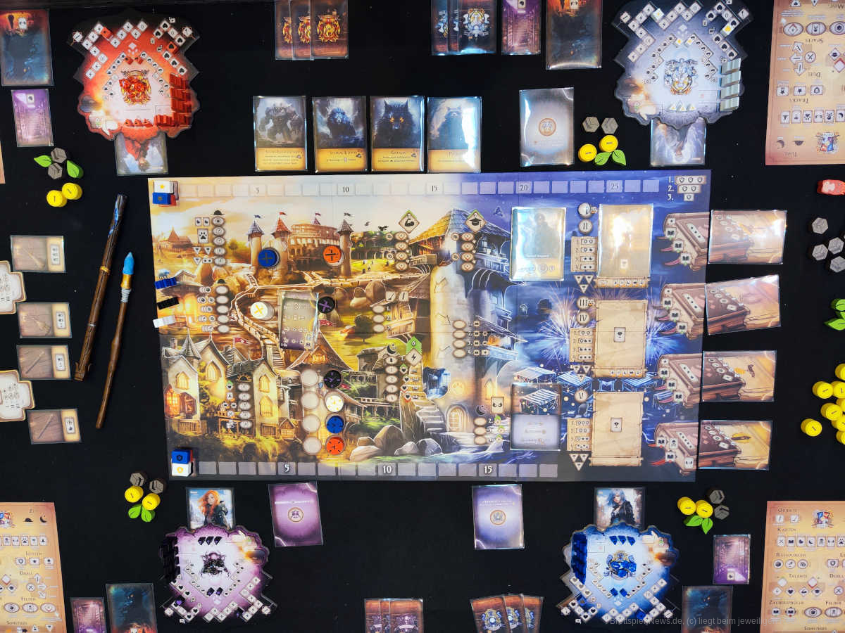 Von der Thematik her erinnert das Spiel direkt beim ersten Blick an das Harry Potter Genre. Das Spielbrett ist von den Aktionsmöglichkeiten her sehr klar strukturiert und man findet sich nach kurzer Zeit darauf sehr gut zurecht. Nur einzelne Symbole sind noch sehr klein gehalten und teilweise sehr schwer zu erkennen. Mir wurde am Stand aber versichert, dass dies in einer weiteren Iteration des Spielbretts mit größeren Symbolen angepasst wird. Die double layered Spielerboards haben eine Größe, die nicht zu viel Platz auf dem Spieltisch einnimmt und lassen schnell alles nötige erblicken. Alle Marker, Worker und Ressourcen sind aus Holz gefertigt und haben eine schöne Größe und Haptik.