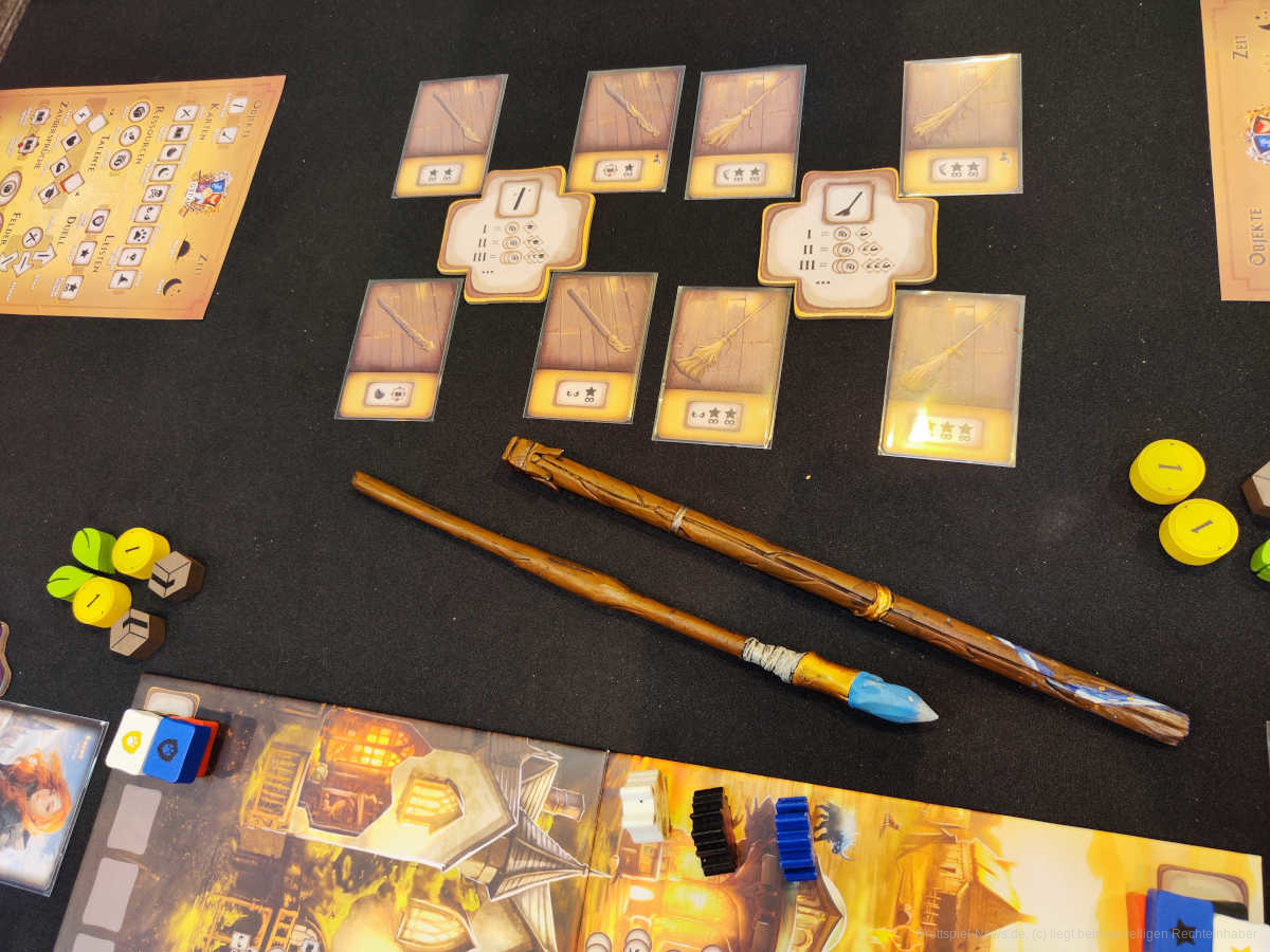 Außerdem können verschiedene Zauberstäbe und Besen erworben werden und auch neue Zaubersprüche wollen am Ende einer Runde gelernt werden. Nach fünf Runden gewinnt der Spieler, der die meisten Siegpunkte erworben hat.